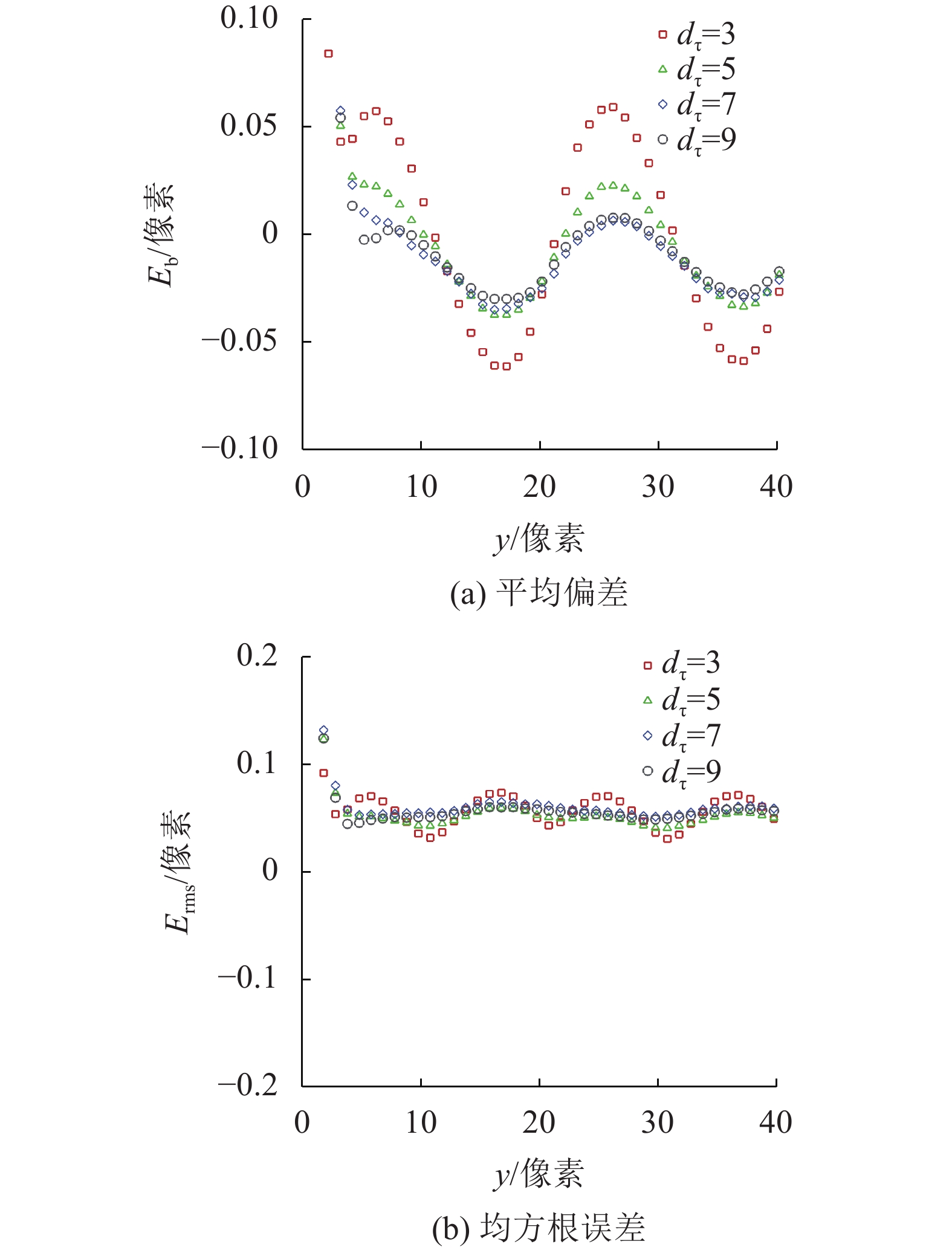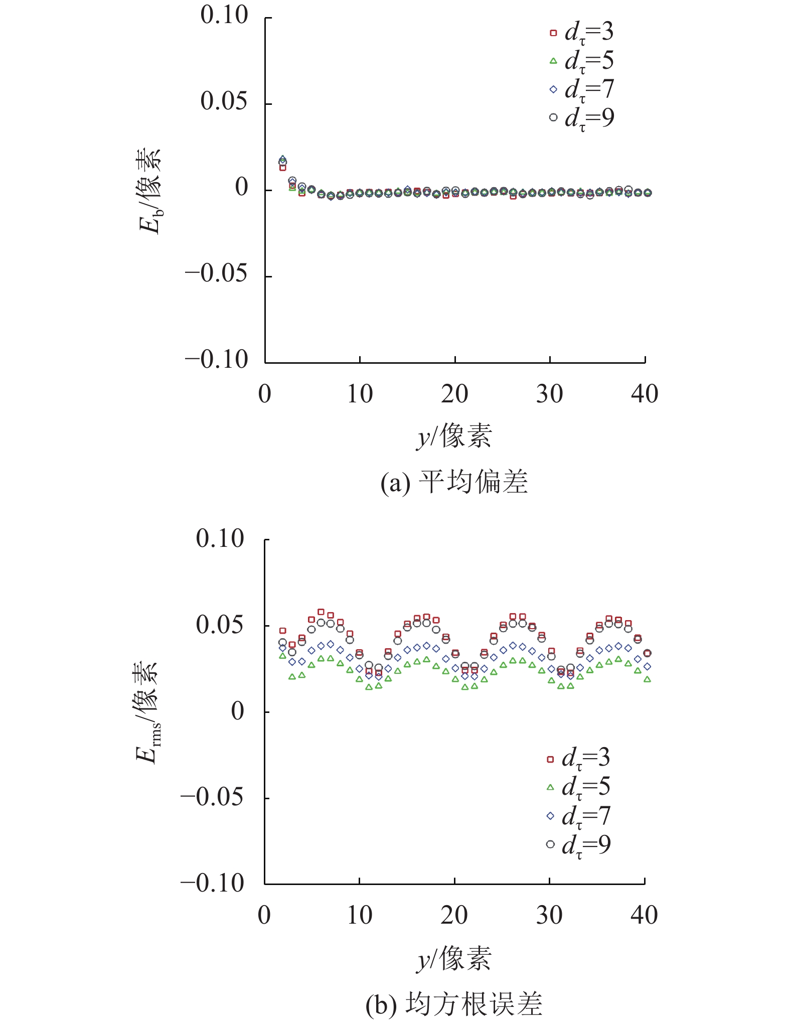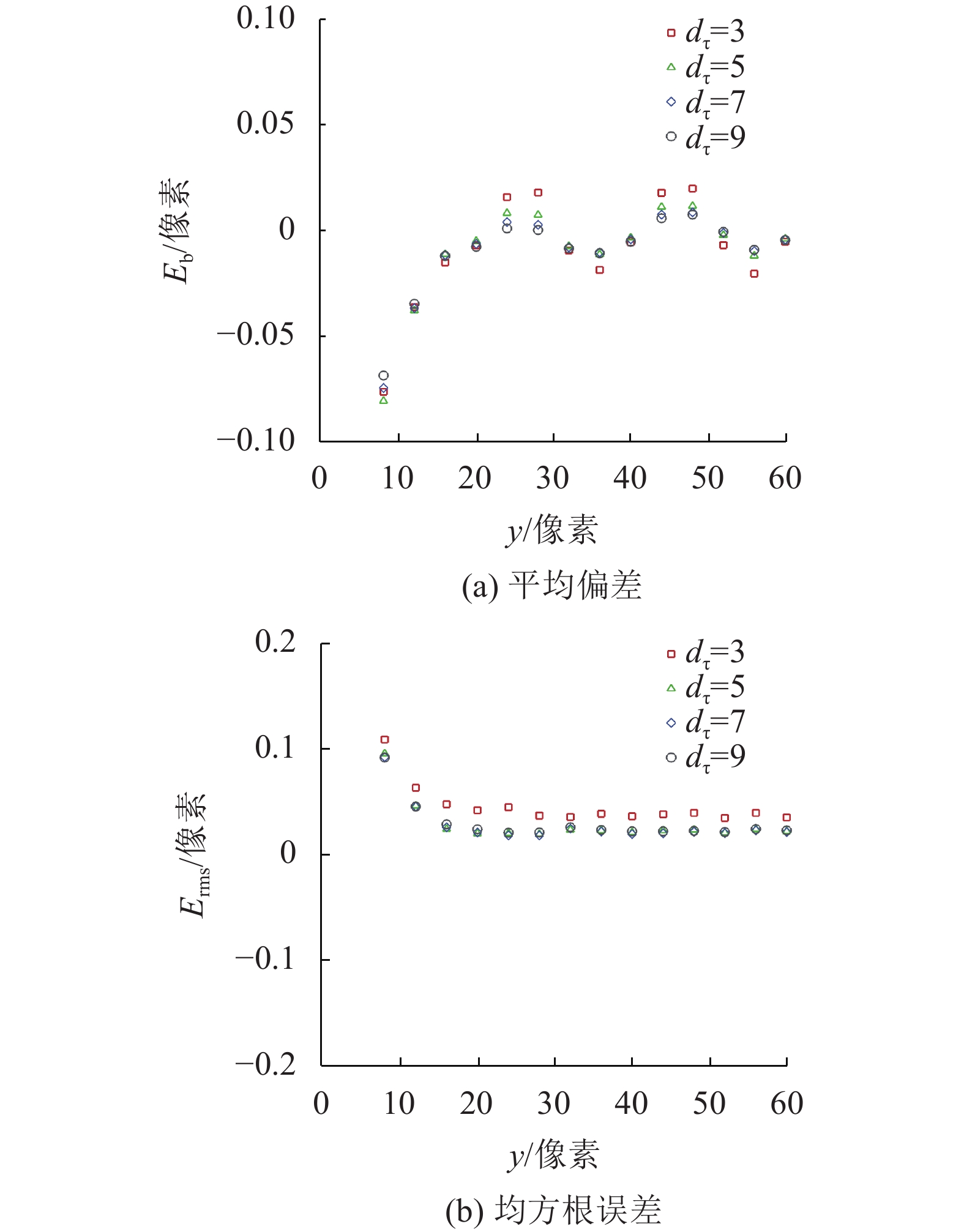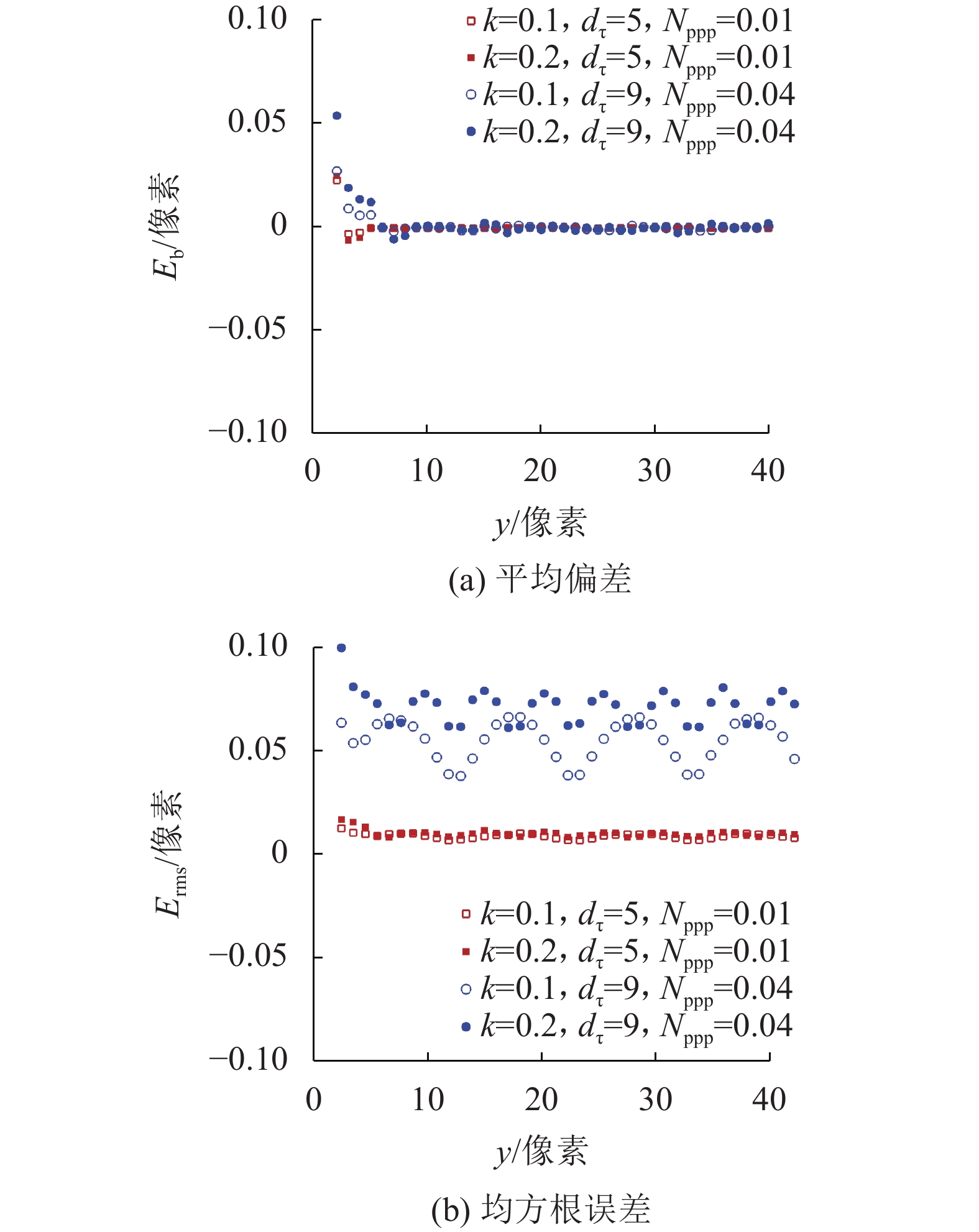 在床面附近,PTV测量结果的平均偏差和均方根误差在最不利参数条件下分别约为0.06像素和0.09像素,使PTV技术在床面附近的最大测量误差达到±0.24像素,但在粒子图像参数较优时的综合测量误差仅约±0.05像素。对比图9中不同粒子图像直径条件下的测量结果可以发现,PTV技术的床面影响高度与粒子图像直径有关,具体数值约等于粒子图像的半径。当粒子中心与床面距离小于半径时,粒子亮度受床面影响不再呈高斯分布,使基于掩膜相关法的粒子中心识别算法无法准确定位粒子中心,这是导致床面附近测量误差较大的原因。