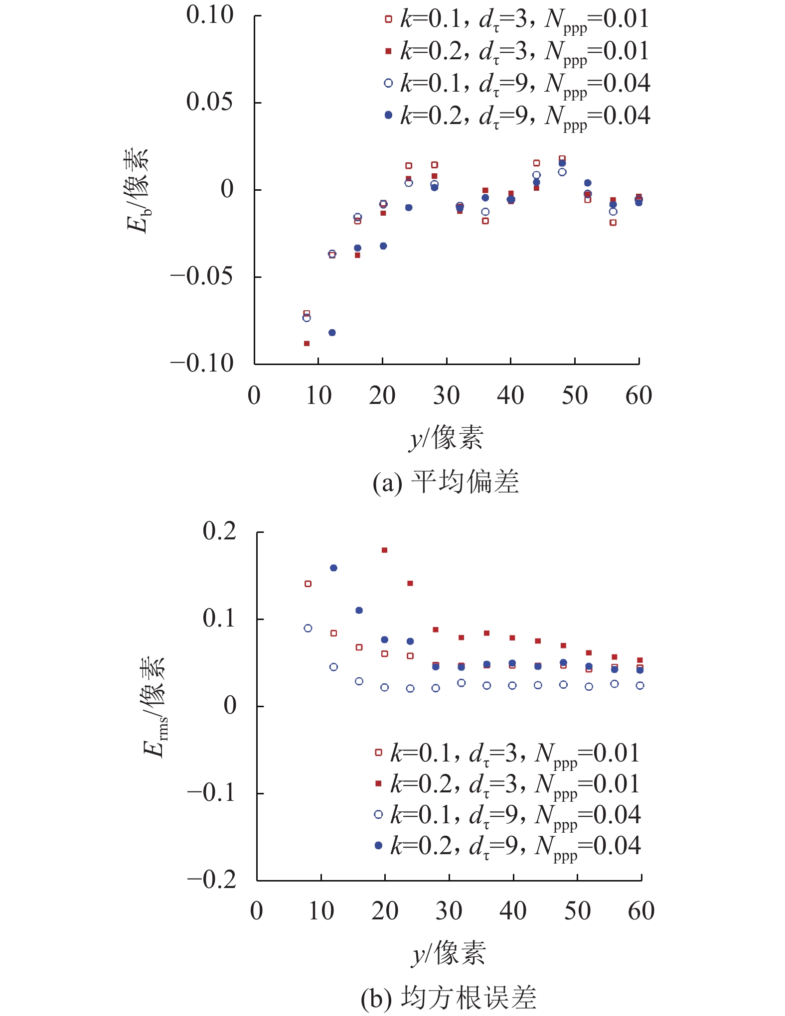 图8为不同速度梯度条件下PIV测量结果的平均偏差和均方根误差。根据第2.2和2.3节图像参数影响分析,PIV技术分别在dτ=3且Nppp=0.01,dτ=9且Nppp=0.04时具有最差和最好的测量精度,故图8中仅展示这两种图像参数对应的结果。在远离床面的区域,平均偏差随速度梯度无明显变化规律,基本保持在±0.02像素;均方根误差随速度梯度的增大而变大,取值范围介于0.02~0.05像素。若以Eb±2Erms度量各技术测量结果的综合精度,则在本文研究参数范围内,PIV技术在不受床面影响时的综合测量精度优于±0.12像素。在床面附近,平均偏差及均方根误差均随着速度梯度的增大而变大,最优测次的综合测量误差已达±0.25像素;同时,床面影响高度由k=0.1时的1倍判读窗口高度(16像素)进一步扩大到k=0.2时的约26像素。