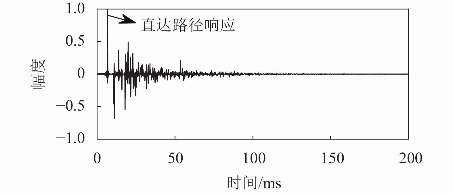 $ {\text{R}}{{\text{T}}_{60}} $ 为混响时间;$ A $ 为总吸声量,$ A={\displaystyle \sum _{i=1}^{6}{S}_{i}\cdot{\alpha }_{i}} $ ,其中,$ {S_i} $ 为各墙面面积,$ {\alpha _i} $ 为各墙面吸声系数;$ V $ 为房间体积;“·”为乘法运算。图1为采用镜像源模型(image–source model, ISM)[18]模拟得到的RIR示意图。