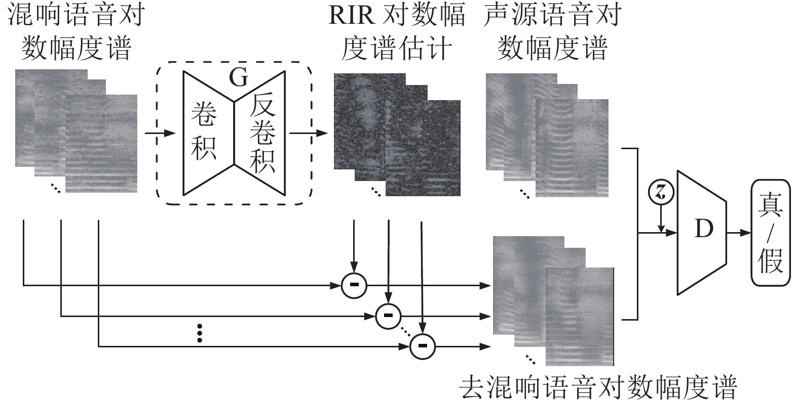 基于上述问题,本文提出了一种加性频域分解模型的生成对抗网络(GAN) 语音去混响算法。首先,以预先降低混响语音数据本身的相关性为目的,在数据处理阶段引入对数运算,将声源语音与RIR在频域中的乘性关系转换为加性关系,从而实现加性分解;然后,采用GAN[16]对混响中的高维特征分布进行学习,使GAN输出RIR的对数幅度谱估计,再通过简单的减法运算,可有效提高去混响语音的整体质量。