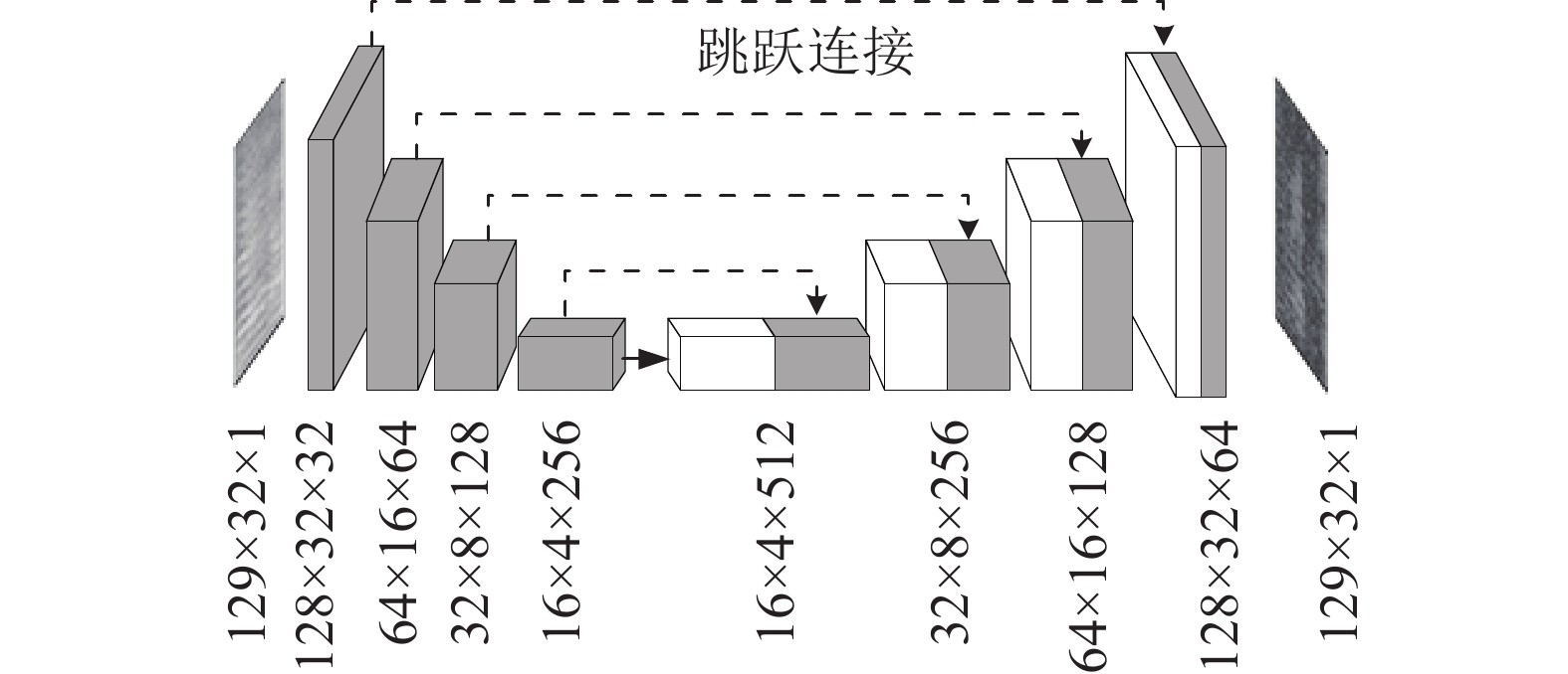 图3中,G网络由卷积和反卷积两部分构成。卷积阶段采用多个卷积层逐层提取混响语音对数幅度谱的高维特征;反卷积阶段则利用多个反卷积层对高维特征进行恢复。但网络引入了跳跃连接结构,因此,每层输入不仅来源于上层输出,还包含卷积阶段对应的各层输出,该结构能提供更多的细节信息。每层输出前均采用带泄漏修正线性单元(leakyReLU)[20]作为激活函数,最后一层输出采用Tanh激活函数,将估计值映射到[–1,1]。其G网络结构如图4所示。