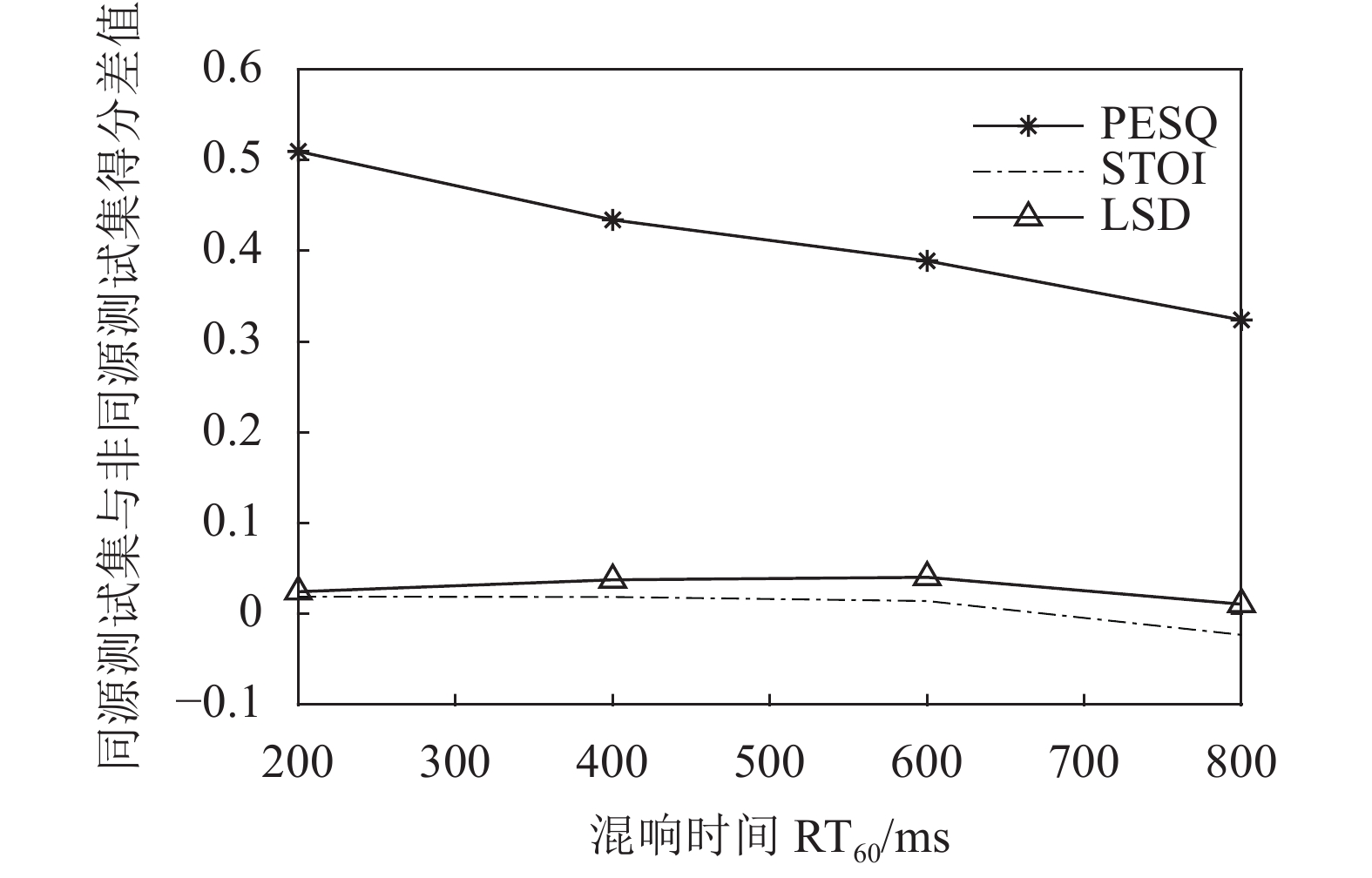 表 4 非同源测试集的 PESQ、STOI、LSD评价得分Table 4 Objective PESQ, STOI, LSD scores of non-homologous test setsRT60/ms 非同源测试集的PESQ评价得分 非同源测试集的STOI评价得分 非同源测试集的LSD评价得分 加性频域分解 本文方法 加性频域分解 本文方法 加性频域分解 本文方法 DNN FCN DNN FCN DNN FCN 200 2.38 2.56 2.63 0.87 0.91 0.92 0.81 0.77 0.77 400 2.10 2.34 2.41 0.82 0.87 0.89 0.92 0.85 0.84 600 1.94 2.22 2.24 0.78 0.85 0.86 0.97 0.91 0.90 800 1.80 2.05 2.07 0.77 0.81 0.81 1.07 1.00 0.99 图5展示了本文方法在 PESQ、STOI、LSD 3种评价指标下同源测试集与非同源测试集的得分差值曲线。