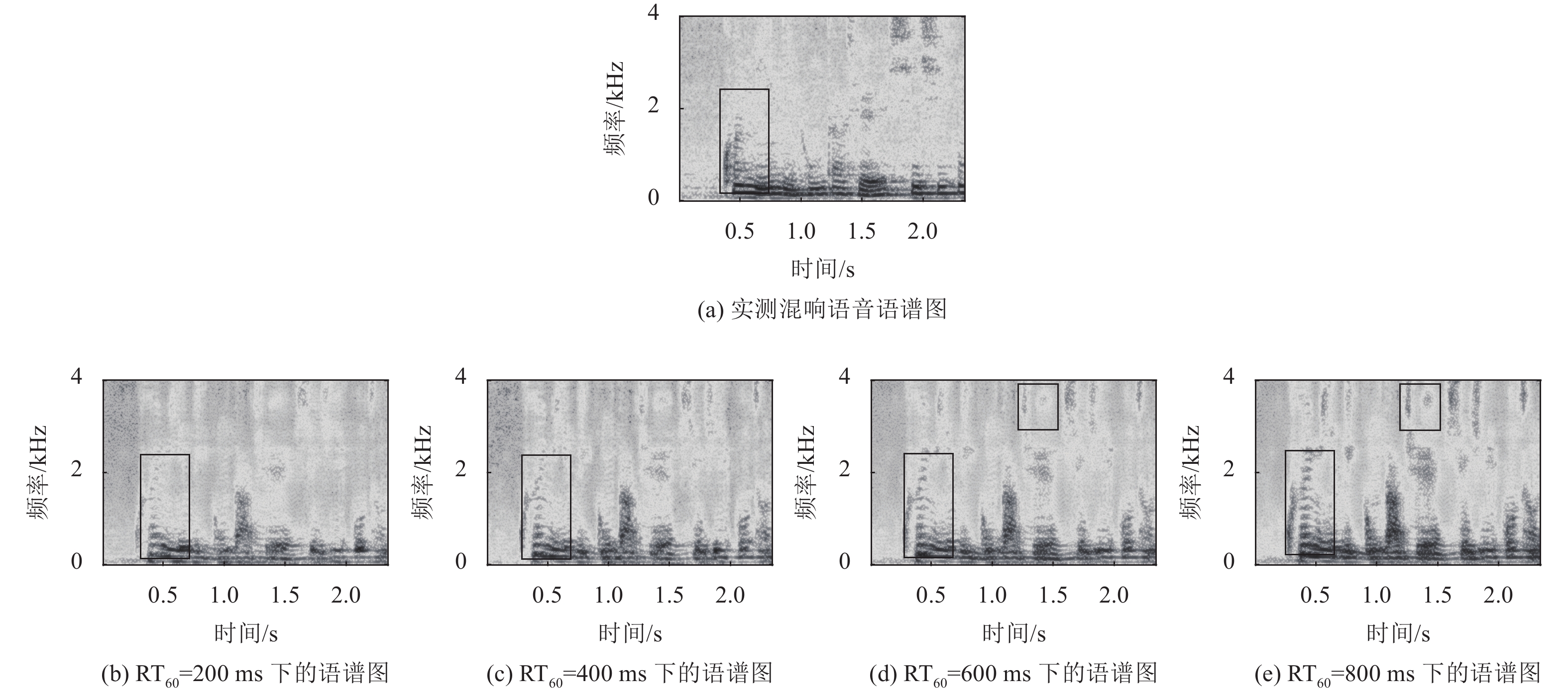 由图7可见:本文方法在低频成份上能较好地抑制混响干扰(图7(b)~(e)的左下方矩形框);本文方法在RT60 = 600 ms下对语音高频成分(小矩形框部分)有一定恢复作用,在RT60 = 800 ms下对语音高频成分(小矩形框部分)恢复作用较明显。但受实际环境和噪声等因素干扰,本文方法获得的去混响语音在自然度上存在部分失真。