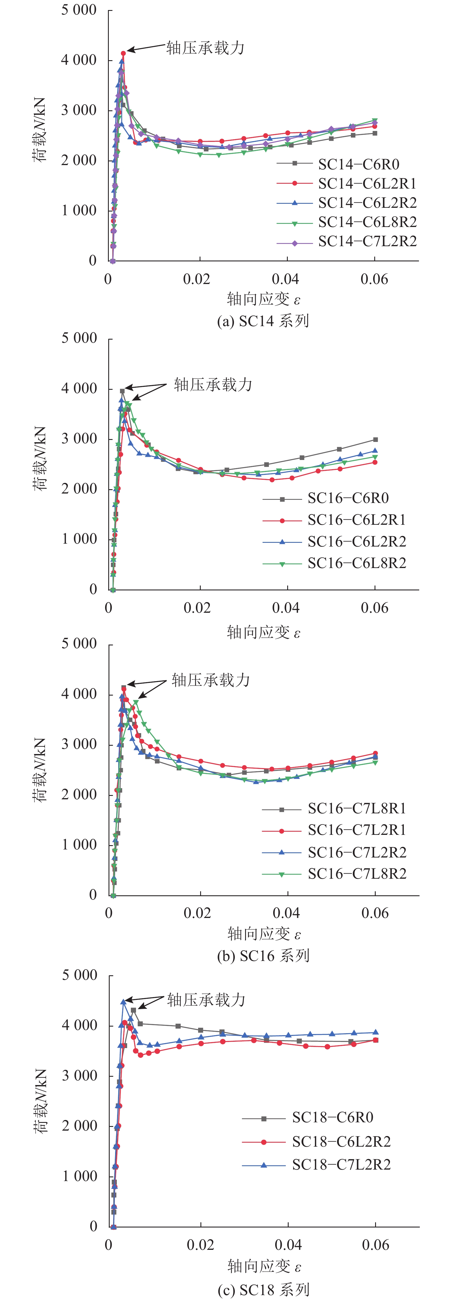 1)复式不锈钢管高强再生块体混凝土短柱试件与未添加再生块体的复式不锈钢高强混凝土短柱试件的荷载–轴向应变曲线相似。加载初期均呈直线上升,曲线有明显的峰值荷载点(轴压承载力);超过峰值荷载后,承载力随应变增大而下降,SC14系列和SC16系列试件竖向荷载下降约为峰值荷载的37%~44%,SC18系列试件的竖向荷载下降约为峰值荷载的14%~19%;加载结束时,所有试件尚能承担峰值荷载的63%以上,其中:SC14和SC16系列试件结束时,承载力分别为峰值荷载的63%和66%以上,如图10(a)和(b)所示;SC18系列承载力为峰值荷载的86%以上,如图10(c)所示。