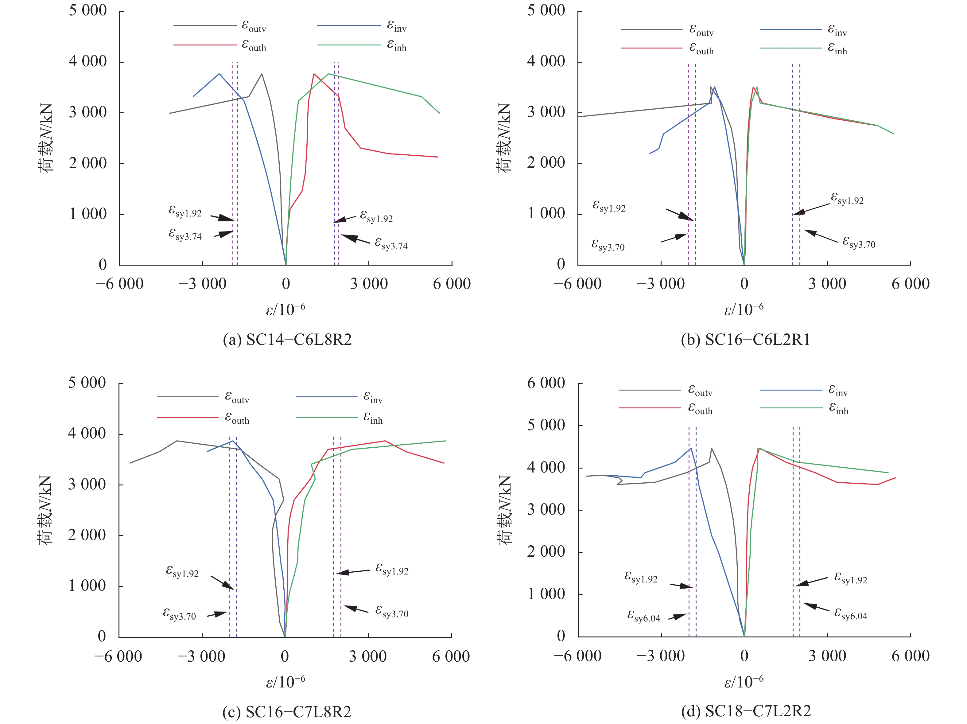 2.3 荷载–应变关系表1给出了试件达轴压4个位移计所测纵向应变的平均值;各试件的轴压荷载与内、外钢管应变关系曲线相似,以试件SC14−C6L8R2、SC16−C6L2R1、SC16−C7L8R2、SC18−C7L2R2为例,绘制荷载–应变关系如图11所示。图11中为试件实测的内外钢管中部截面的纵向和横向应变数据,纵向受压应变为负,横向受拉应变为正。εoutv为外方形不锈钢的纵向应变,εouth为外方形不锈钢的横向应变,εinv为内部圆钢管的纵向应变,εinh为内部圆钢管的横向应变,εsy1.92、εsy3.70、εsy3.74和εsy6.04分别为钢管壁厚为1.92、3.70、3.74和6.04 mm的钢材屈服应变。