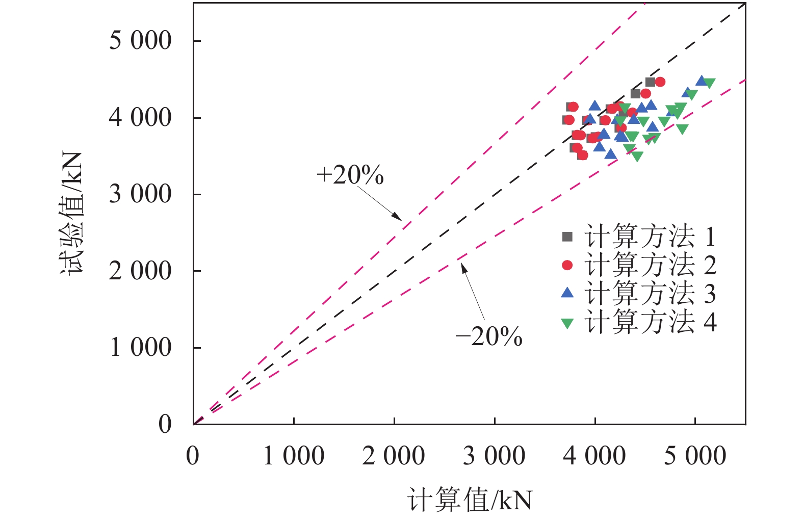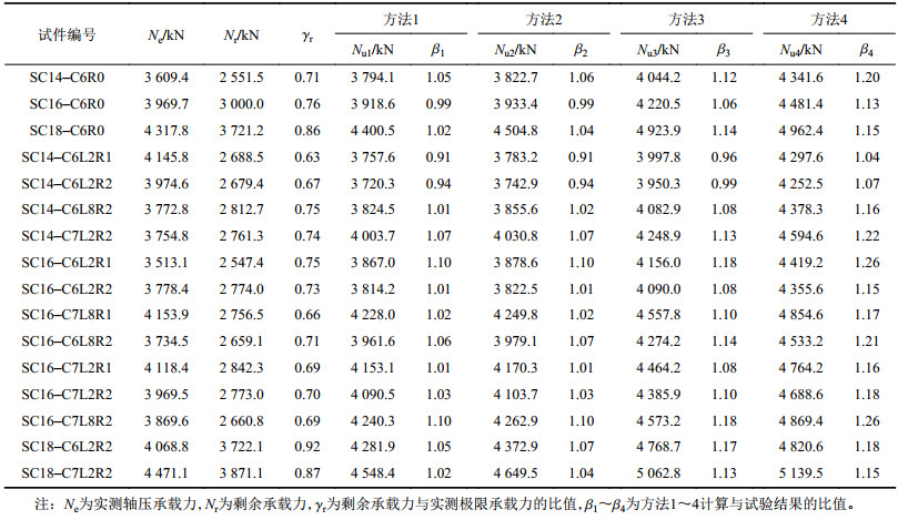 由表4和图13可知,方法1和方法2计算结果和试验结果更接近,主要原因在于:1)在圆钢管内部添加旧混凝块体骨料本身力学性能与普通新混凝土相比存在一定差异,使得再生混合混凝土组合抗压强度的试验结果离散性略大于普通钢管混凝土;方法1在估算复式不锈钢管高强再生块体混凝土短柱的轴压承载力时,未考虑钢管的约束作用对内部混凝土强度的提高作用。2)计算方法2考虑圆形和方形钢管混凝土截面达到峰值荷载时所对应的轴向应变不同(圆形截面的峰值应变较大),复式不锈钢管高强再生块体混凝土短柱在达到峰值荷载时,内部圆钢管混凝土截面尚未达到轴压峰值荷载,其峰值承载力仅发挥了约85%,相当于钢管对混凝土的有利约束效应,通过截面组合作用,把圆钢管混凝土剩余的15%峰值承载力发挥在了剩余承载力阶段,对于提高方钢管混凝土柱的变形能力非常有利,进行截面设计时,可以通过调整圆钢管截面来达到较高承载力和较好的变形能力。折减后的承载力计算结果与试验实测结果较为接近,且可以结合已有的方形和圆形钢管混凝土截面的相关设计公式,具有较好的适用性和可操作性。3)计算方法3充分考虑了内圆钢管对核心再生块体混凝土的约束效应的提高作用,忽略了复式截面达极限承载力时,圆形钢管混凝土截面尚处于上升段的情况,使得计算结果略高于试验实测结果;方法4综合考虑了方形不锈钢和内圆钢管的组合约束效应对整个复式钢管混凝土柱截面混凝土强度的套箍作用,同样忽略了圆形截面的差异,计算结果也略高于试验实测结果。