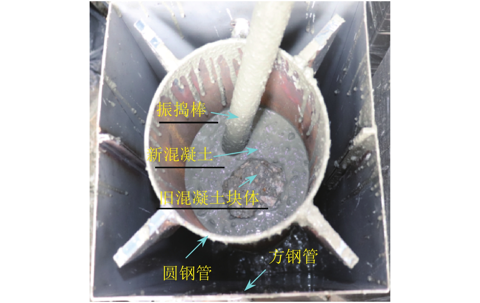 试验采用的两种强度再生混凝土块体从梁和剪力墙构件中拆除,再生混凝土块体尺寸为60~100 mm,如图3所示。新混凝土采用强度等级为C60和C70的自密实商品混凝土,坍落度为240 mm,自密实混凝土各组分含量及力学性能如表2所示。表2中,fcu,28 d为新混凝土28 d强度。粗骨料为5~16 mm连续粒级玄武岩碎石,针、片状含量为2.8%,压碎值为8.4%。在浇筑前将旧混凝土块体洗净表面浮尘,用编织袋编号称装好,放置自来水池内提前充分浸泡24 h。试件浇筑时,先在试件底部倒入一层约50~60 mm厚的新混凝土,然后将旧混凝土块体与新混凝土交替放入圆钢管内,并用插入式振捣棒充分振捣;将圆钢管内的混凝土浇筑完毕,在圆钢管外和方不锈钢管之间灌入新混凝土,图4为试件浇筑振捣过程的照片。