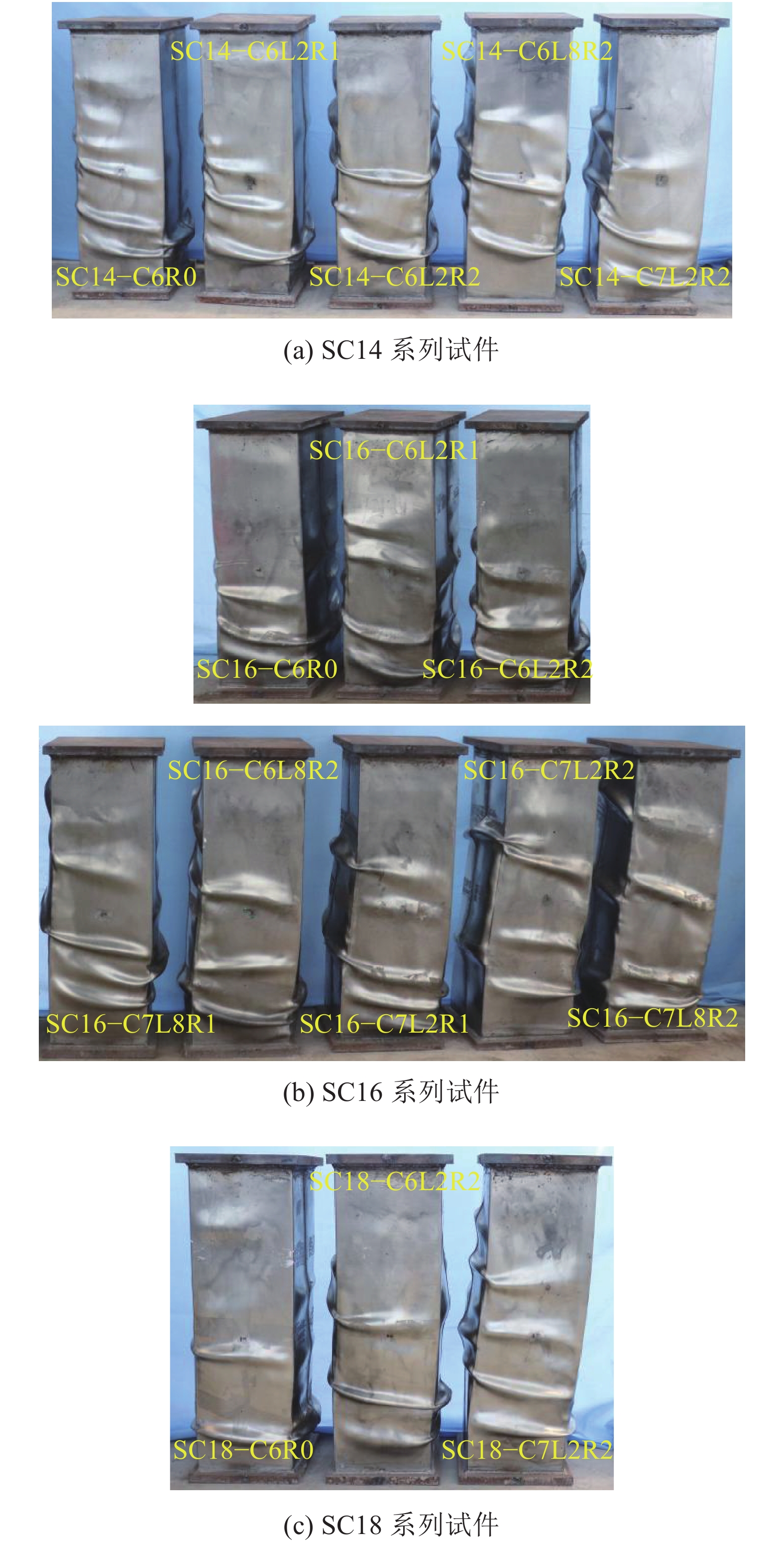 图7为16个试件加载结束后的破坏特征。由图7可见:各试件的破坏形态基本相似,外不锈钢管鼓曲明显;试件SC18–C6R0鼓曲2圈;SC16–C6L2R1鼓曲3圈;SC16–C7L8R1和SC18–C7L2R2鼓曲最多,为4圈。
