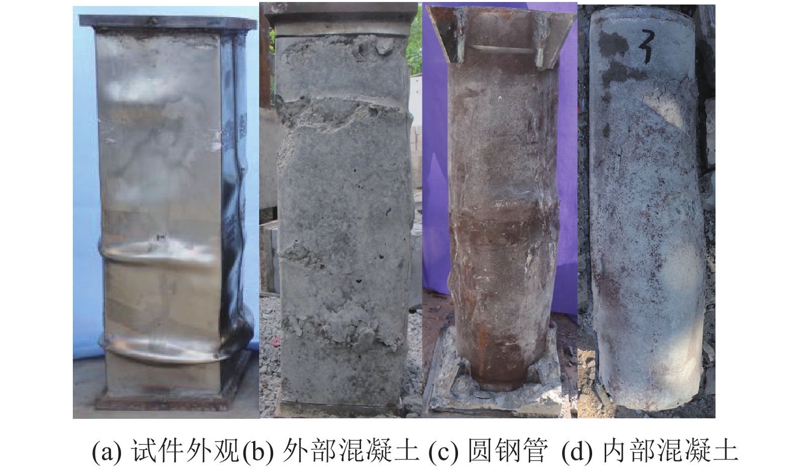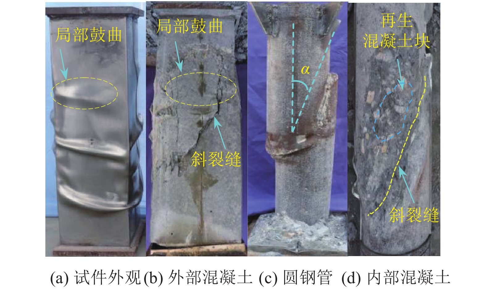 试件的内部圆钢管混凝土呈腰鼓型破坏和斜剪型破坏两种类型,与文献[16]中复式钢管高强混凝土柱的破坏类型相似。图8为SC14–C6L8R2试件斜剪型破坏形态。由图8(a)可知,外不锈钢管呈3道鼓曲,混凝土鼓曲位置在外钢管约束作用下外凸,混凝土仍维持外凸的整体形状。由图8(b)可知,屈曲位置的外不锈钢钢管对内部混凝土仍具有较好的环箍作用,局部压碎状态的混凝土并未脱落,外混凝土面有一道较大的斜裂缝,斜裂缝以下的混凝土有横向劈裂的趋势。由图8(c)可知,剥开圆钢管外层混凝土后,分布在圆钢管两侧的局部鼓曲形成斜剪破坏特征,剪切面与轴向夹角α约为45°左右。切开剪切破坏位置的钢管,可见内部混凝土在两道鼓曲间有一道斜裂缝,这是由于内部混凝土的压剪破坏先于钢管局部屈曲而混凝土在压剪破坏面处形成斜裂缝。由图8(d)可知,剔除部分松散混凝土后,再生混凝土内部的再生块体混凝土与新混凝土界面结合良好,并未出现界面破坏的情况。