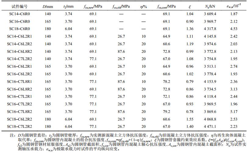 2)取代率和钢管截面相同情况下,添加相同强度旧混凝土块体的复式不锈钢管高强再生块体混凝土短柱的轴压承载力随新混凝土强度增大呈略微增大趋势,如表1所示。新混凝土强度从69.1增至77.1 MPa,SC16系列试件轴压承载力提高3.5%~4.8%,SC18系列试件轴压承载力提高9.0%左右;约束效应系数ξ从1.19减小至1.08,试件SC14–C6L2R2与试件SC14–C7L2R2相比,轴压承载力降低约5.5%;再生混凝土取代率小于20%情况下,添加不同强度旧混凝土块体对试件轴压承载力影响不明显。