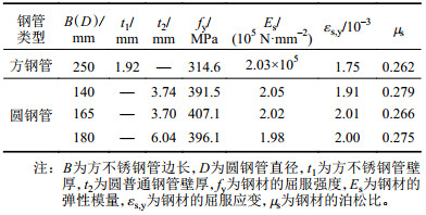 式中,fa1和fa2分别为方形不锈钢管和内圆普通钢管的钢材屈服强度,Aa1和Aa2分别为方形不锈钢管和内圆钢管的截面积,Ac,out和Ac,cor分别为内圆钢管外部和内部的混凝土截面积,fc,out和fc,cor分别为内圆钢管外部和内部混凝土的轴心抗压强度。