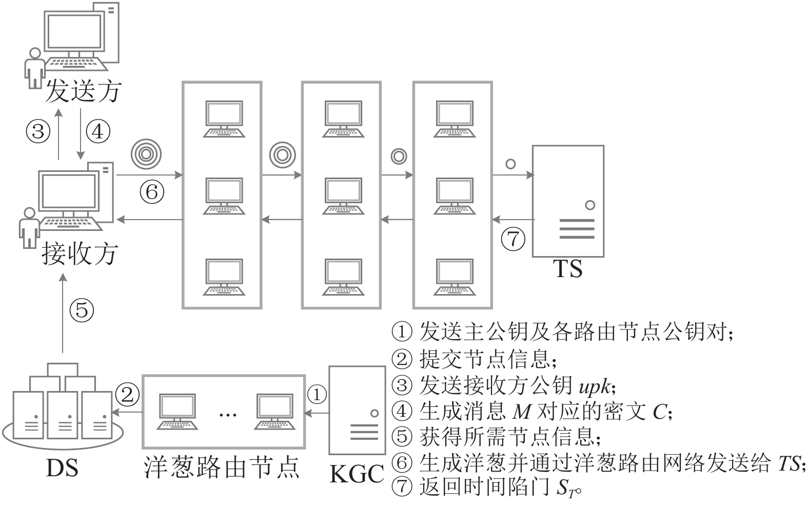 上述非交互式时间服务器模式中,时间服务器采用周期性地广播时间陷门,以实现时间陷门的分发,因此可保证接收者身份的隐私性。但该方法存在的问题是:1)若时间服务器广播的时间跨度太大,会导致细粒度不够,部分用户的解密时间无法满足;2)若跨度太小,会导致时间服务器负担很大且网络流量大大增加。并且,在问题1)情况下,如果让无对应时间陷门的用户直接交互式地向时间服务器进行查询,又会暴露查询者身份。针对此问题,目前尚无解决方案。因此,亟需设计出一种新的TRE方案,在时间服务器粗粒度广播时间陷门满足大部分用户需求的前提下,实现用户匿名查询任意其他时间的陷门。可提供匿名访问性的洋葱路由(onion routing,OR)技术可为研究者们提供一种解决思路。