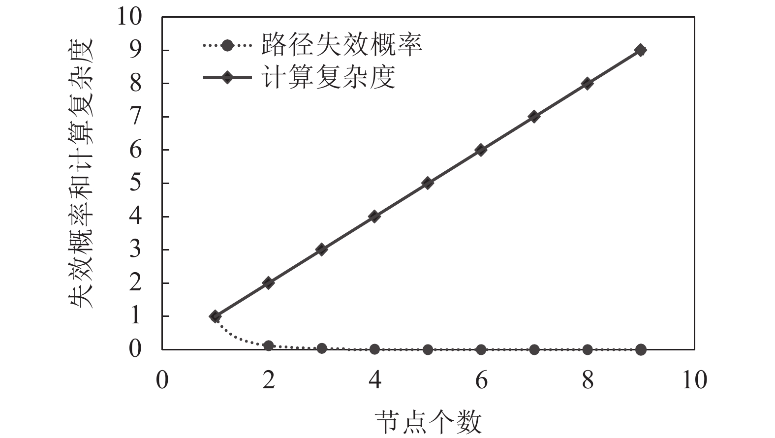| 图2 不同节点个数的路径失效概率和计算复杂度 Fig. 2 Path failure probability and computational complexity of different number of nodes |