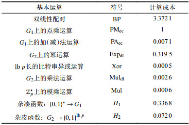 | 表1 相关基本运算相对于点乘运算的计算成本统计 Tab. 1 Calculation cost of related basic operations relative to the point multiplication operation |