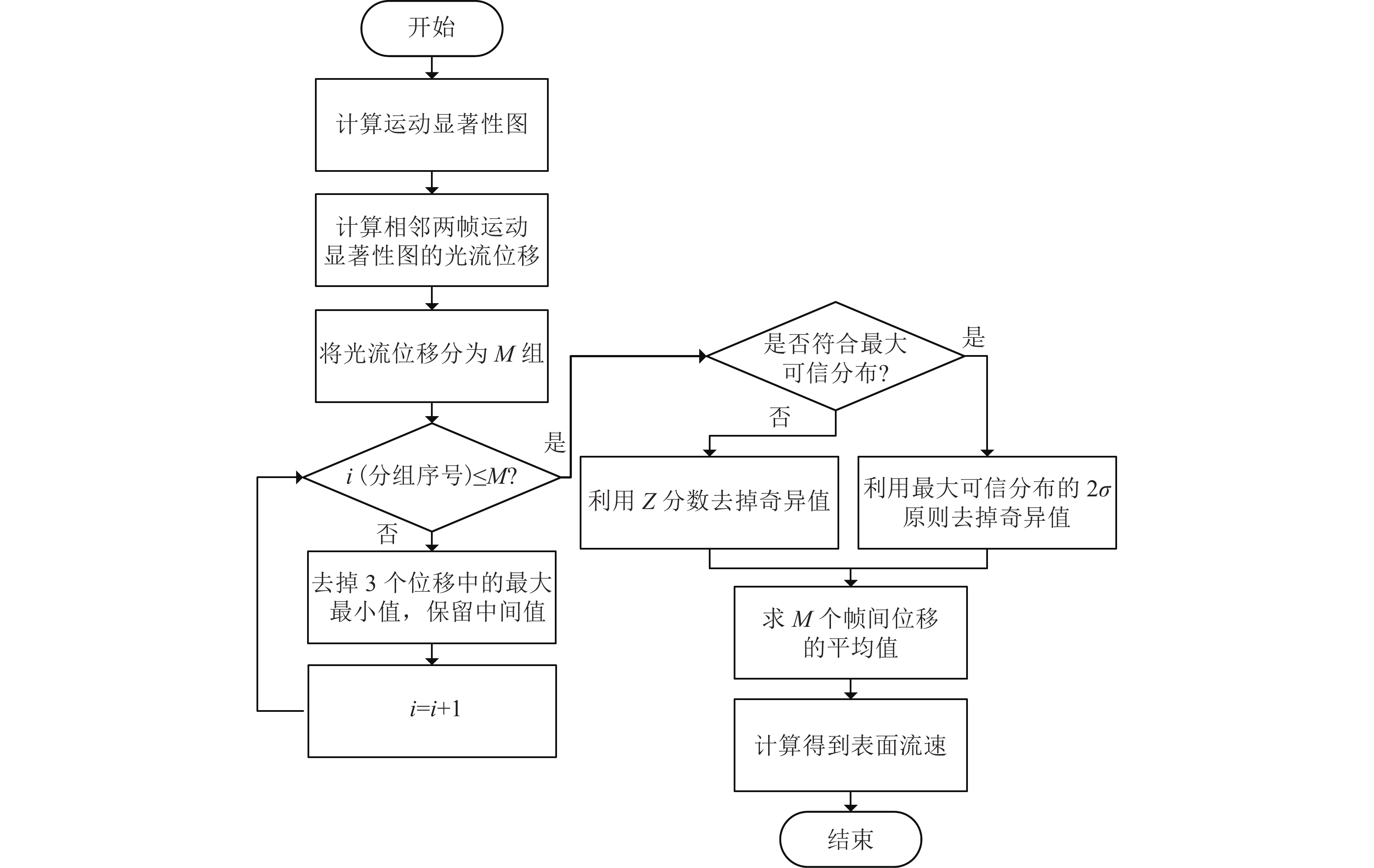 $\{ \Delta {d_{i,1}},\Delta {d_{i,2}}, \Delta {d_{i,3}} \}$ ,其中$ i $ 为分组序号,然后将3个数据中的最大值$ \Delta {d_{i,\max }} $ 最小值$ \Delta {d_{i,\min }} $ 去掉,取中间值$\Delta {d_{i,{\rm{mid}}}}$ 作为这组数据的平均帧间位移$\Delta {d_{i,{\rm{avg}}}}$ ,最后对M个平均帧间位移数据进行去掉奇异值的处理,处理过程为:Step1:若