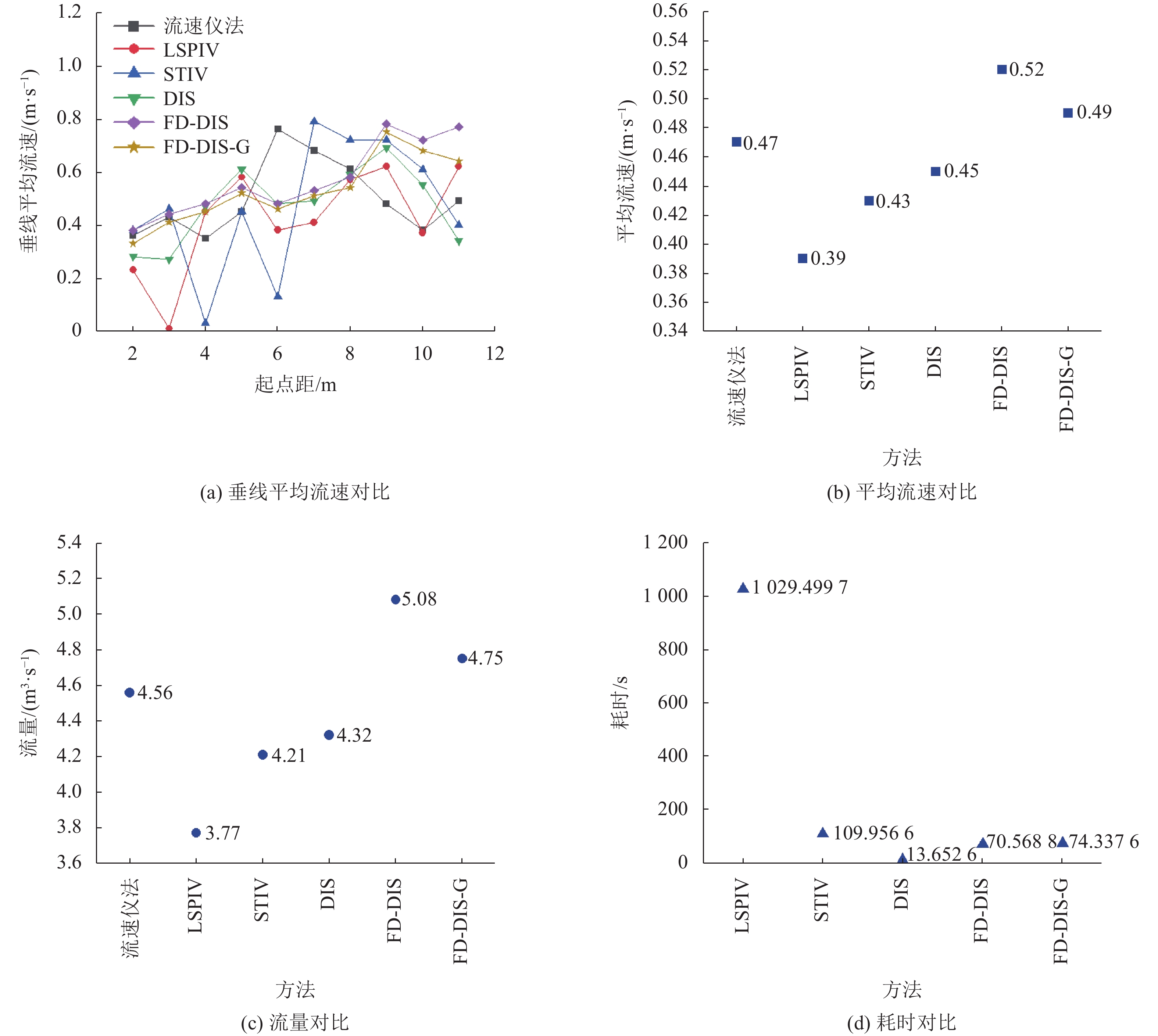 方法 垂线平均流速/(m·s–1) 平均流速/(m·s–1) 流量/(m3·s–1) b=2 m b=3 m b=4 m b=5 m b=6 m b=7 m b=8 m b=9 m b=10 m b=11 m 流速仪 0.36 0.43 0.35 0.45 0.76 0.68 0.61 0.48 0.38 0.49 0.47 4.56 LSPIV 0.23 0.01 0.45 0.58 0.38 0.41 0.57 0.62 0.37 0.62 0.39 3.77 STIV 0.38 0.46 0.03 0.45 0.13 0.79 0.72 0.72 0.61 0.40 0.43 4.21 DIS 0.28 0.27 0.47 0.61 0.48 0.49 0.59 0.69 0.55 0.34 0.45 4.32 FD-DIS 0.38 0.44 0.48 0.54 0.48 0.53 0.58 0.78 0.72 0.77 0.52 5.08 FD-DIS-G 0.33 0.41 0.45 0.52 0.46 0.51 0.54 0.75 0.68 0.64 0.49 4.75 表 4 5种方法的绝对误差对比