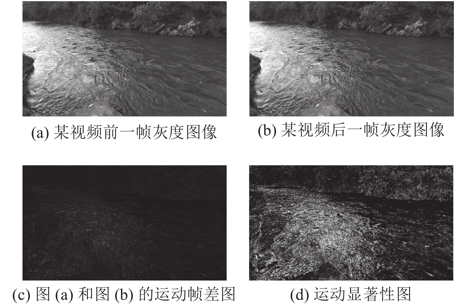 对车辆或行人等运动目标进行运动检测时,目标和背景之间通常很容易就被区分开来,但在天然河流的视频图像中水面是作为整体一起运动的[22]。图2为河流表面图和运动显著性图。
