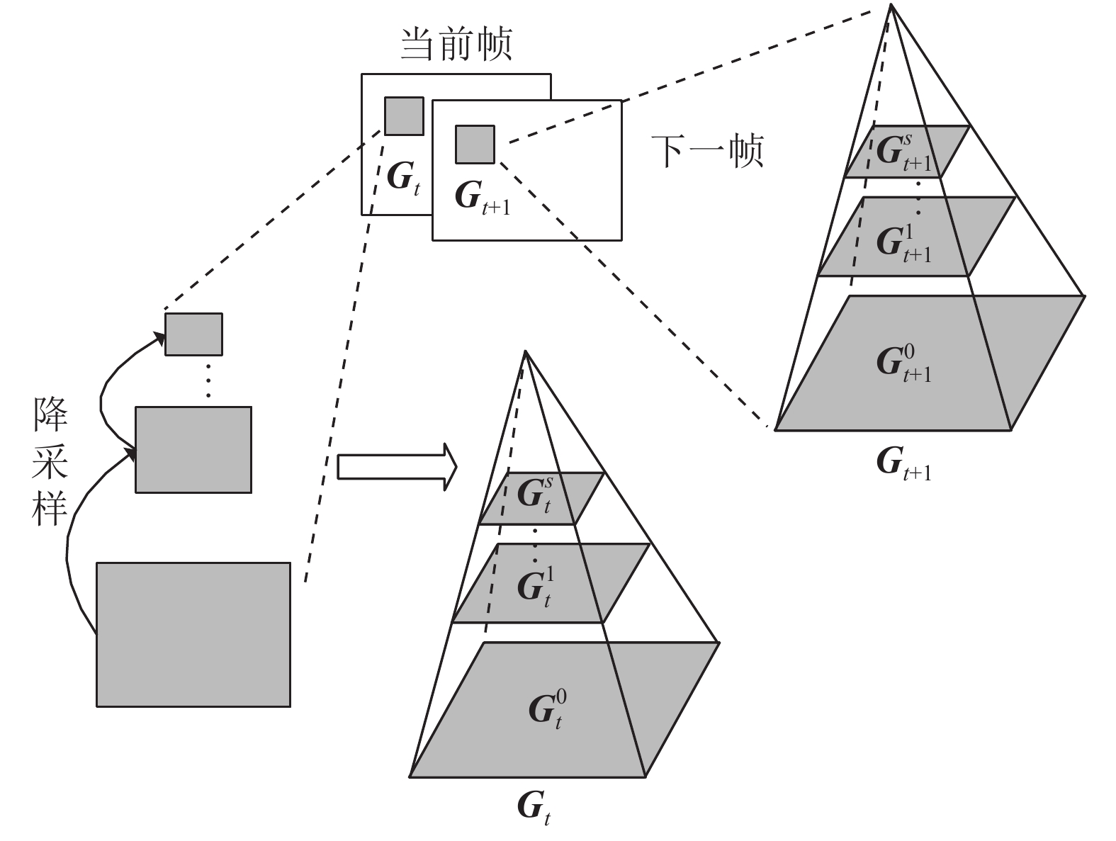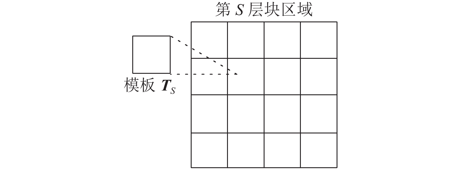 $\;{\rho}$ 为尺度金字塔下采样系数,分别对${{\boldsymbol{G}}^t}$ 和${{\boldsymbol{G}}^{t + 1}}$ 构建尺度金字塔,如图3所示。定义模板${{\boldsymbol{T}}_s}$ 为金字塔在第$ s $ 层块区域${\boldsymbol{G}}^{t,s}$ 里的子区域,模板大小为$ ({\theta _s} \times {\theta _s}) $ 。用均匀的网格块初始化${\boldsymbol{G}}^{t,s}$ 且每个网格块的大小和模板$ {T_s} $ 相同,如图4所示,并用式(2)初始化第k个网格块${\boldsymbol{I}}^k$ 中心点的光流位移$( {u_{k,init}}, {v_{k,init}} )$ 。$$ ( {u_{k,init}}, {v_{k,init}} ) ={\boldsymbol{a}}_{(x_k/\rho, y_k/\rho)}^{s+1}\cdot\rho $$ (2) 式中: