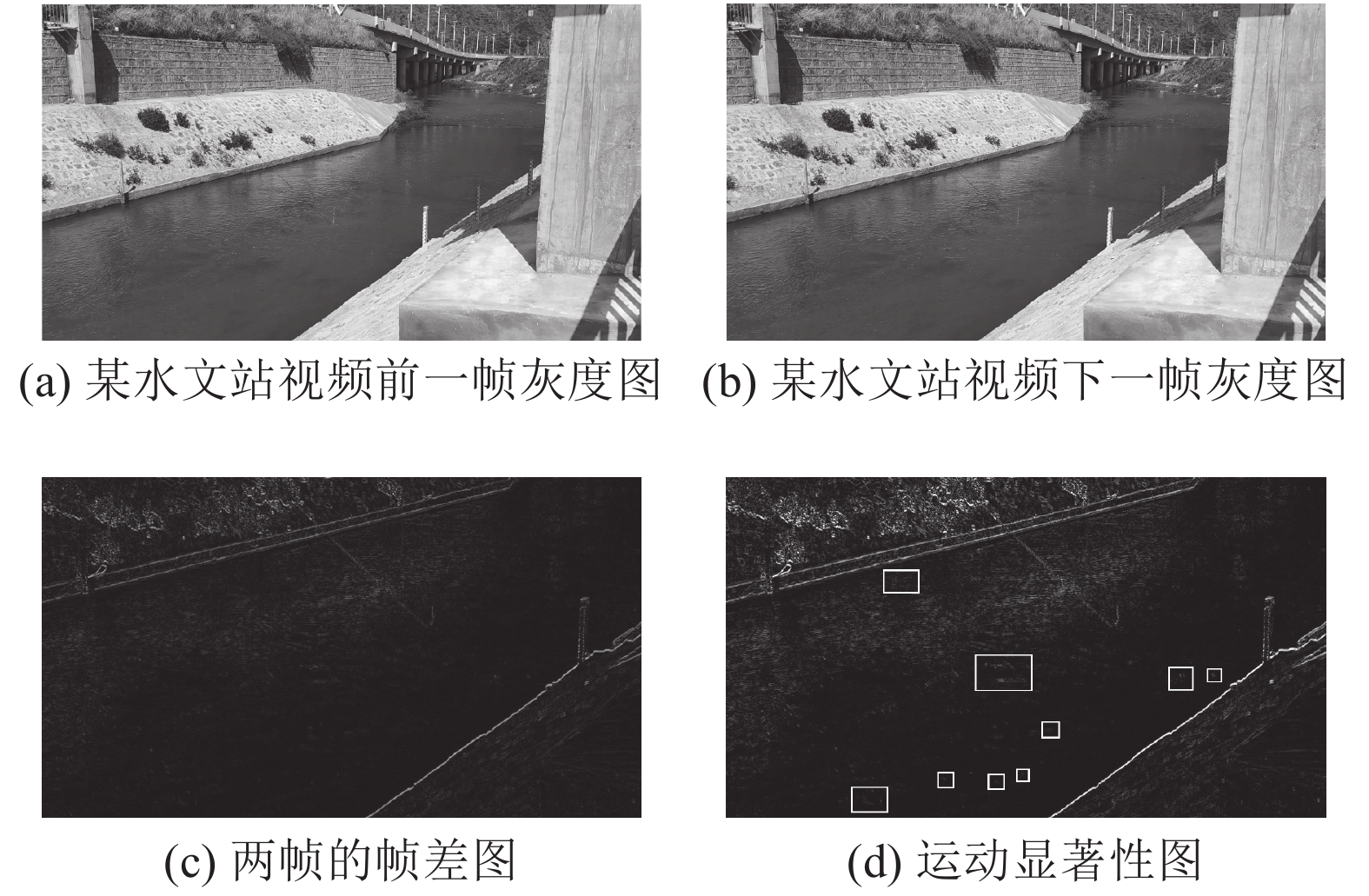 $ 1\;920 \times 1\;080 $ 像素/英寸,为捕捉细微的水面运动,先对325帧图片进行运动显著性计算。在利用视频图像进行表面流速测量时,大部分方法对图像的预处理是对图像进行灰度化,但在低流速下的河流中如果只对图像进行灰度化处理会难以突出很多微小的水面运动。本算法在进行运动矢量估计前先进行运动显著性计算,分别对帧差图中大于和小于设定阈值的像素值进行了缩放,认为大于设定阈值的像素为细微的运动区域对其进行放大,从而达到了运动显著性计算的效果,突出了微小的水面运动。图7为获取运动显著性图过程。从图7(d)中看出进行运动显著性计算后水面运动更为清晰,且捕捉到了很多细微的水面运动,如7(d)中方框框出的部分。2.2.2 密集光流场