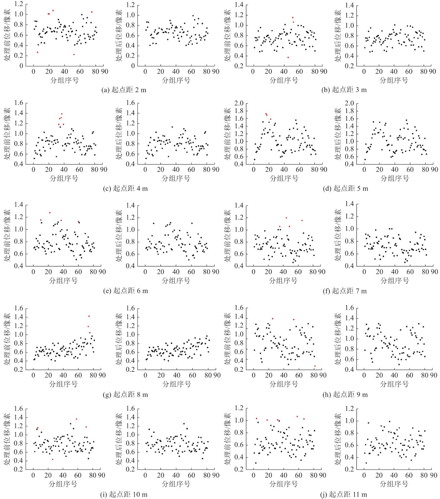 设计了一种分组处理奇异值的方法,对相邻4帧中较大、较小的光流估计进行剔除,并保留中间值,并对所有组保留的光流估计值按照其是否满足独立同分布分别进行奇异值处理,使得由于不明显的光照变化或视频缺帧丢帧导致的奇异光流估计被舍弃。如图9所示,奇异值(图9中红色的点)剔除后每个测量点的帧间像素位移分布更集中,从而降低了由于视频拍摄过程中操作不当而产生的误差,故本方法测得的值更稳定,更接近于流速仪真值,因此提高了本方法的精度。