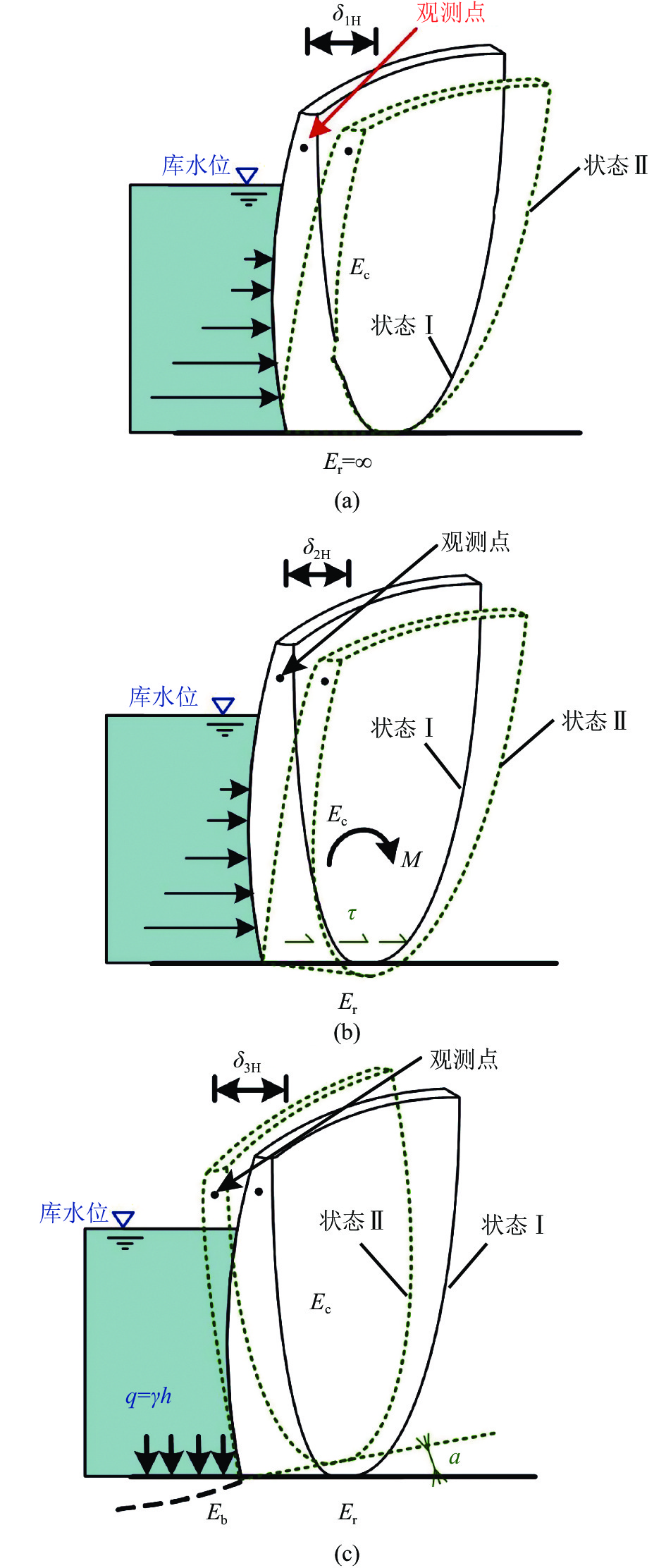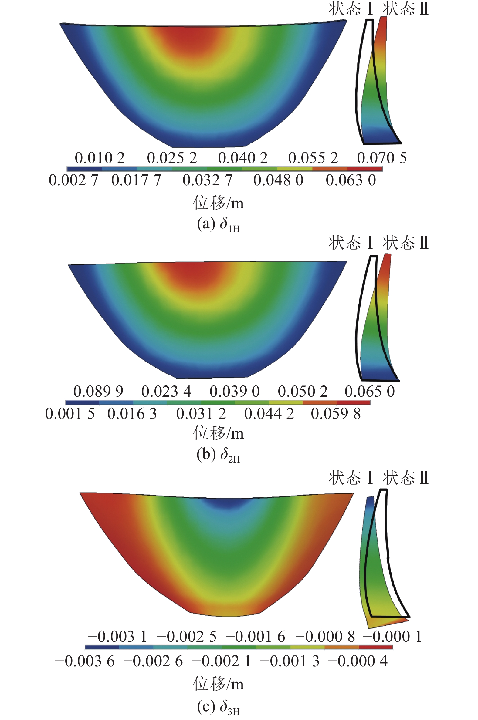 $ {\delta _{\rm{H}}} $ 可分为3部分:静水压力作用在坝体上引起坝体自身的位移$ {\delta _{1{\rm{H}}}} $ ,及其作用在地基面上产生的内力,导致坝基变形引起的位移$ {\delta _{2{\rm{H}}}} $ ,库水重作用使得地基面转动所引起的位移$ {\delta _{3{\rm{H}}}} $ ,如图1所示。对于混凝土拱坝,水压分量常采用上游水深H的4次多项式计算: