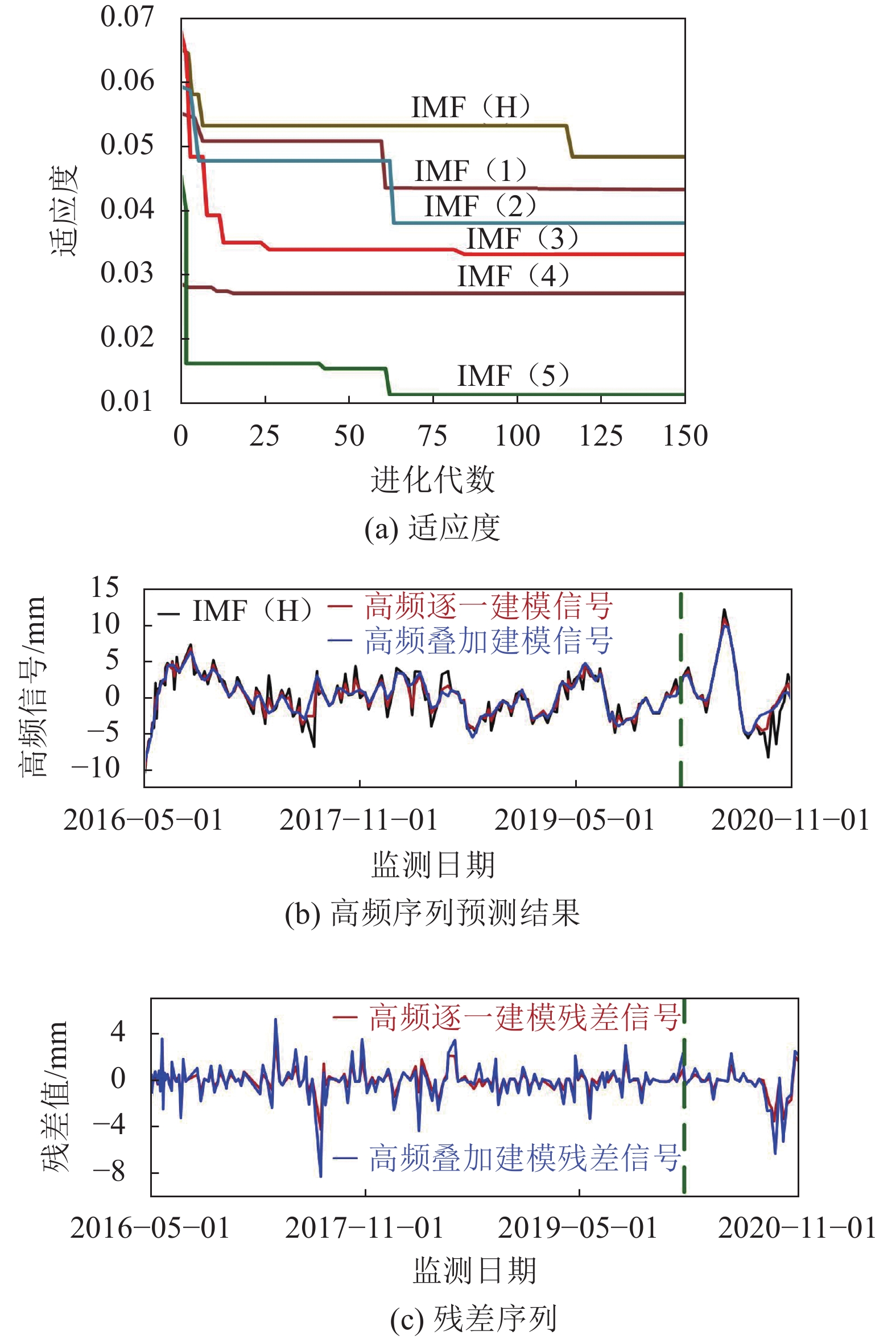 $ r\left( t \right) $ 为低频信号。对于分解得到的高频IMF信号,采用PSO–ELM模型对其逐一建模预报后叠加。其中,PSO–ELM预测模型中最大迭代次数Tmax、种群粒子数N、隐层节点个数L是影响预测模型的训练速度及精度的重要因素,为实现模型预测的最佳性能,确定预测模型的最优参数:隐层节点个数为30,种群粒子数为20,最大迭代次数为200,惯性权重w为0.9,加速常数c1和c2均设为1.8。同时,为验证对高频IMF信号建模的有效性,对IMF1~IMF5序列叠加得到的IMF(H)构建PSO–ELM预测模型。各高频预测模型的适应度曲线与预测结果如图11所示。由图(11)可知,对分解得到的高频IMF逐一建模预测,并将每个分量的最大误差与MAPE计算结果相叠加,得到最大误差和MAPE分别为0.089和14%,而未进行分频修正的高频分量预测结果的最大误差和MAPR分别为0.167和19%。说明分解得到的高频信号逐一建模预测更能有效挖掘序列内蕰的有效信息。