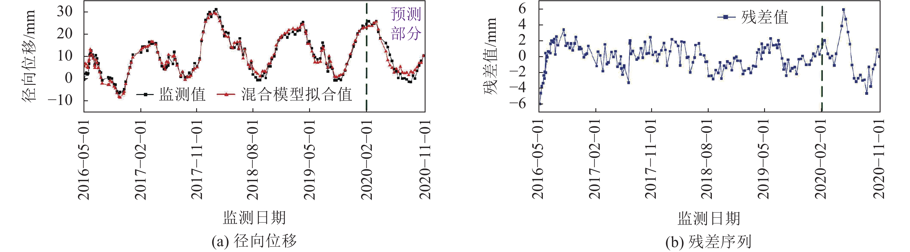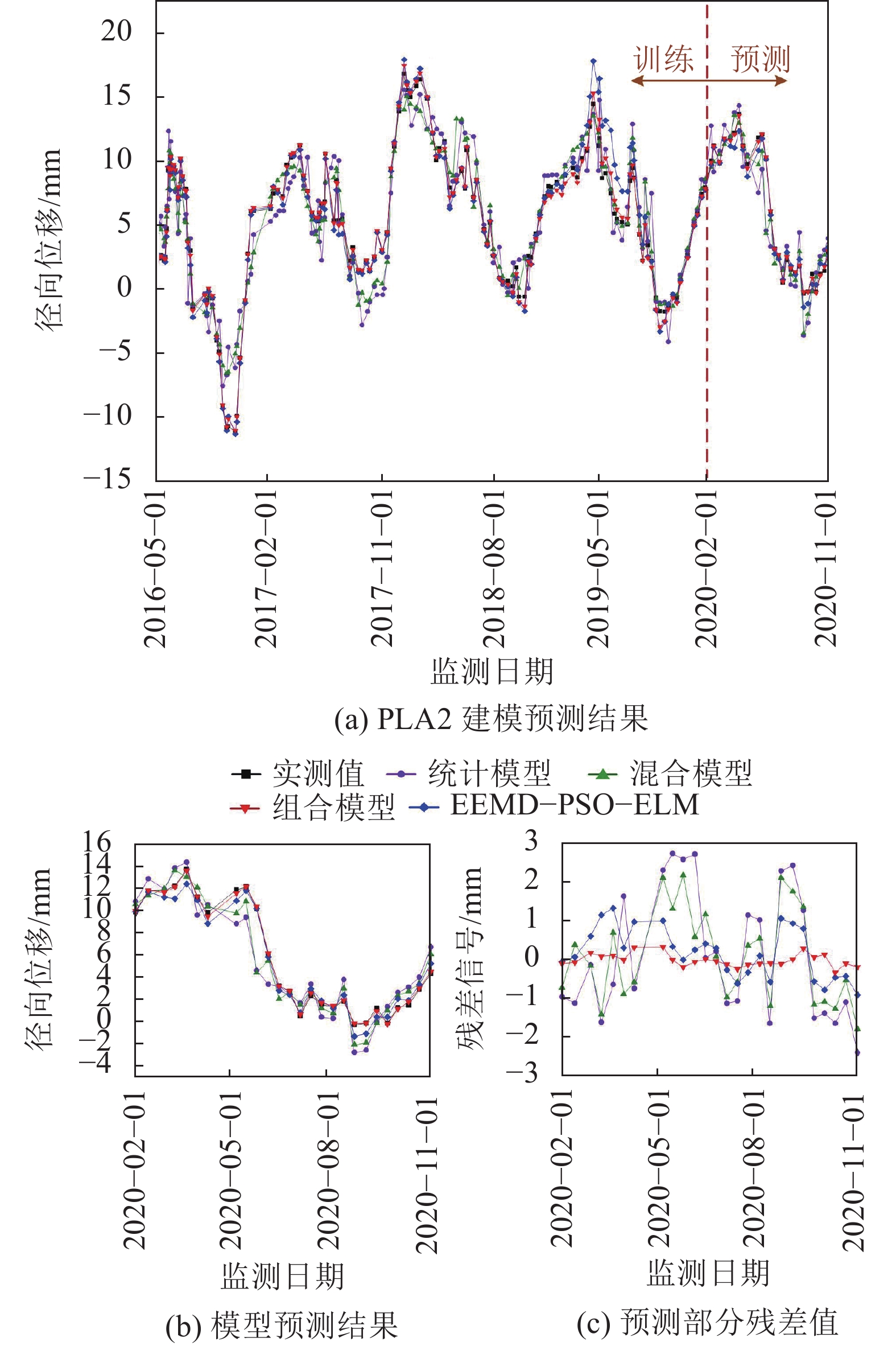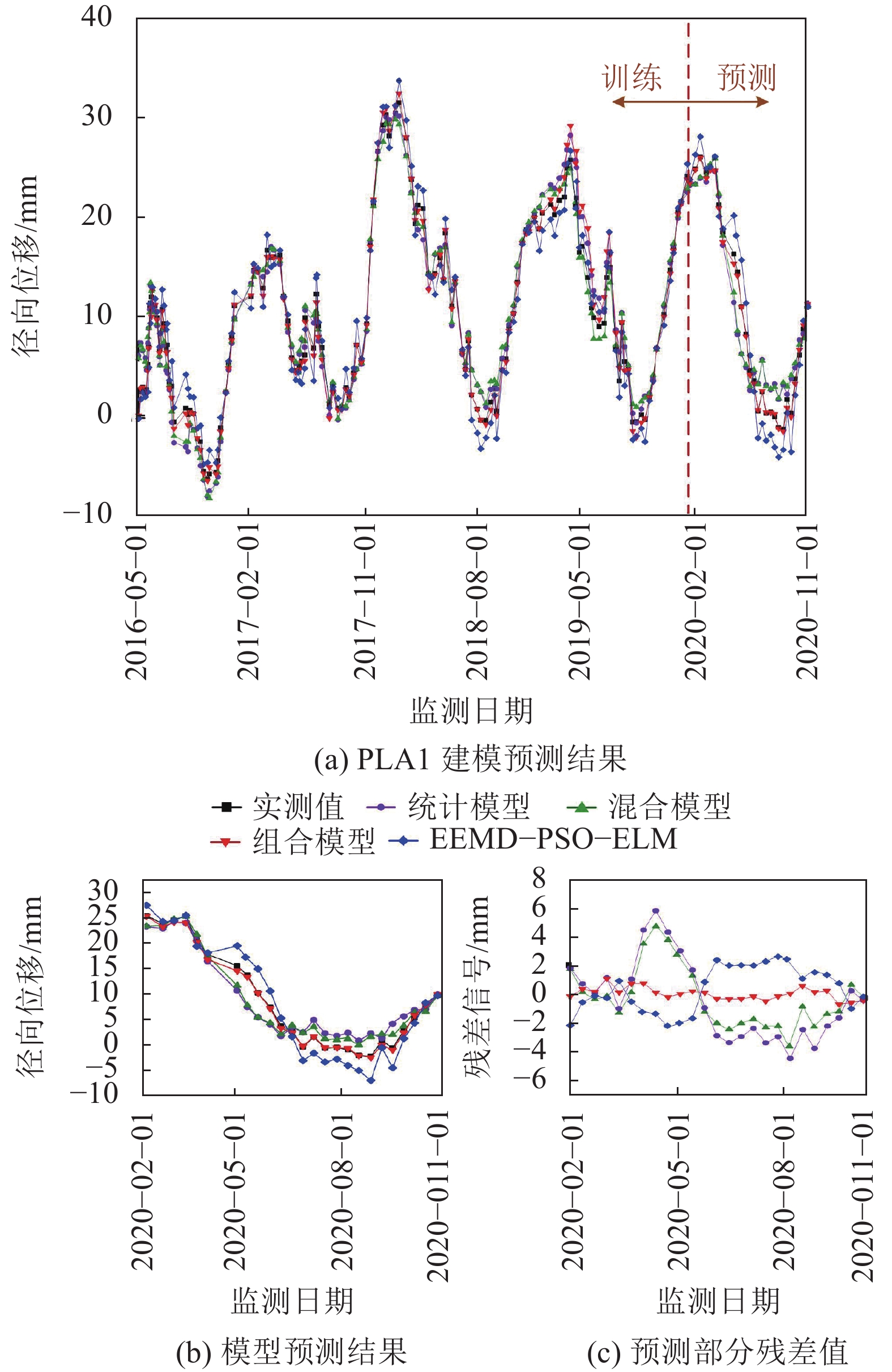 1)考虑筑坝材料性能演变对变形预测模型的影响,结合有限元方法,构建混凝土拱坝变形预测混合模型;同时,针对混凝土坝变形混合模型残差序列呈现出的周期性特征,结合EEMD、ELM与SARIMA模型,有效挖掘了残差序列中所蕴含的有效信息成分。较单一模型而言,该模型可以捕捉到变形监测信号中绝大部分数据特征,有效弥补了常规模型信息挖掘手法单一的缺陷。