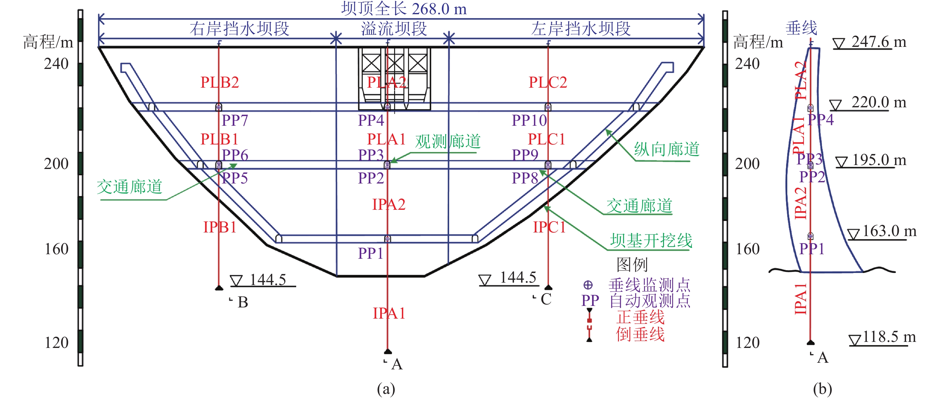 某混凝土双曲拱坝最大坝高99.1 m,坝顶宽5.0 m,坝顶高程247.6 m,坝顶长287.94 m。该坝正常蓄水位与校核洪水位高程分别为244.0 m和246.72 m,调节库容与总库容分别为0.62×108m3和1.05×108 m3。为监测该坝坝体与坝基的水平变形,该坝布置了3组垂线监测仪器,包括6条正垂线和4条倒垂线,布设方案如图5所示。