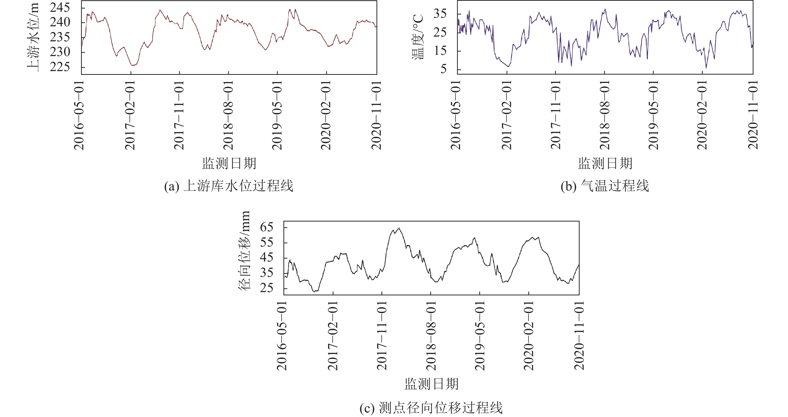 以位于拱冠梁坝段的正垂测点PLA1为例,选取2015–05–01—2020–02–13实测径向位移加以分析。其中,以2015–05–01—2019–11–16监测数据用以模型训练,剩余数据用于检验模型的预测性能。监测时段内测点的径向位移与上游水位和当地气温的实测数据如图6所示。