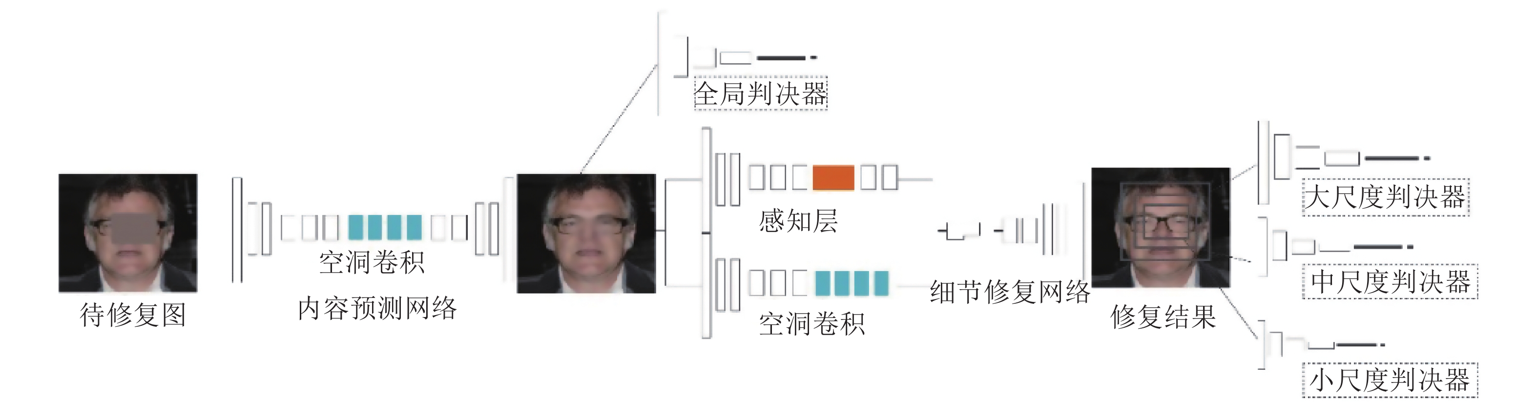 为了解决传统修复方法的不足,学者们探索基于深度学习的修复方法。基于CNN的图像修复方法[9]只能修复破损区域较小的图像,于是Pathak等[10]以重构损失和生成对抗损失为目标函数,训练修复大破损区域的深度神经网络,但是该方法只能修复单一形状的破损区域,修复自然背景、纹理复杂的真实图像时效果不佳。于是Lizuka等[11]在其基础上引入两个GAN损失判决器,用空洞卷积层[12]代替常规的卷积层,使得修复网络捕获更多的图像信息,该方法可以修复任意形状的破损图像,而且能够生成新颖的结构,整体修复效果较好,但是,其修复结果包含细节失真,需后期进行色彩处理,而且该方法修复高分辨率图像时效果较差。随后,Yeh等[13]提出在破损图像的潜在空间中搜索最接近的编码及解码的修复算法,该方法修复高分辨率图像中的小破损区域时效果比文献[11]改善很多,但是,随着破损区域的增大,其修复性能急剧下降。Yang等[14]提出了一种基于图像内容和纹理约束的联合优化多尺度神经补丁合成方法,通过匹配与深度分类中最相似的中层特征相关的补丁来产生高频细节,在修复高分辨率图像时,可得到满意的视觉效果,但是,其优化网络在训练过程中不稳定,容易导致模型崩溃。