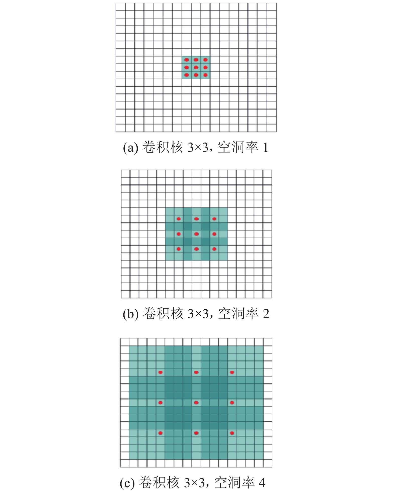 图2(a)是卷积核为3×3、空洞率为1的空洞卷积,红色的9个点表示与核卷积的点。图2(b)是卷积核为3×3、空洞率为2的空洞卷积,绿色7×7区域是信息感受野区域。图2(c)是卷积核为3×3、空洞率为4的空洞卷积,其信息感受野达到15×15。相对于传统卷积操作,信息感受野和卷积层数成线性关系,空洞卷积的信息感受野呈指数级增长。因此,用空洞卷积层代替池化层不仅能增加修复网络的信息感受野,还会减少修复过程中图像信息的丢失。