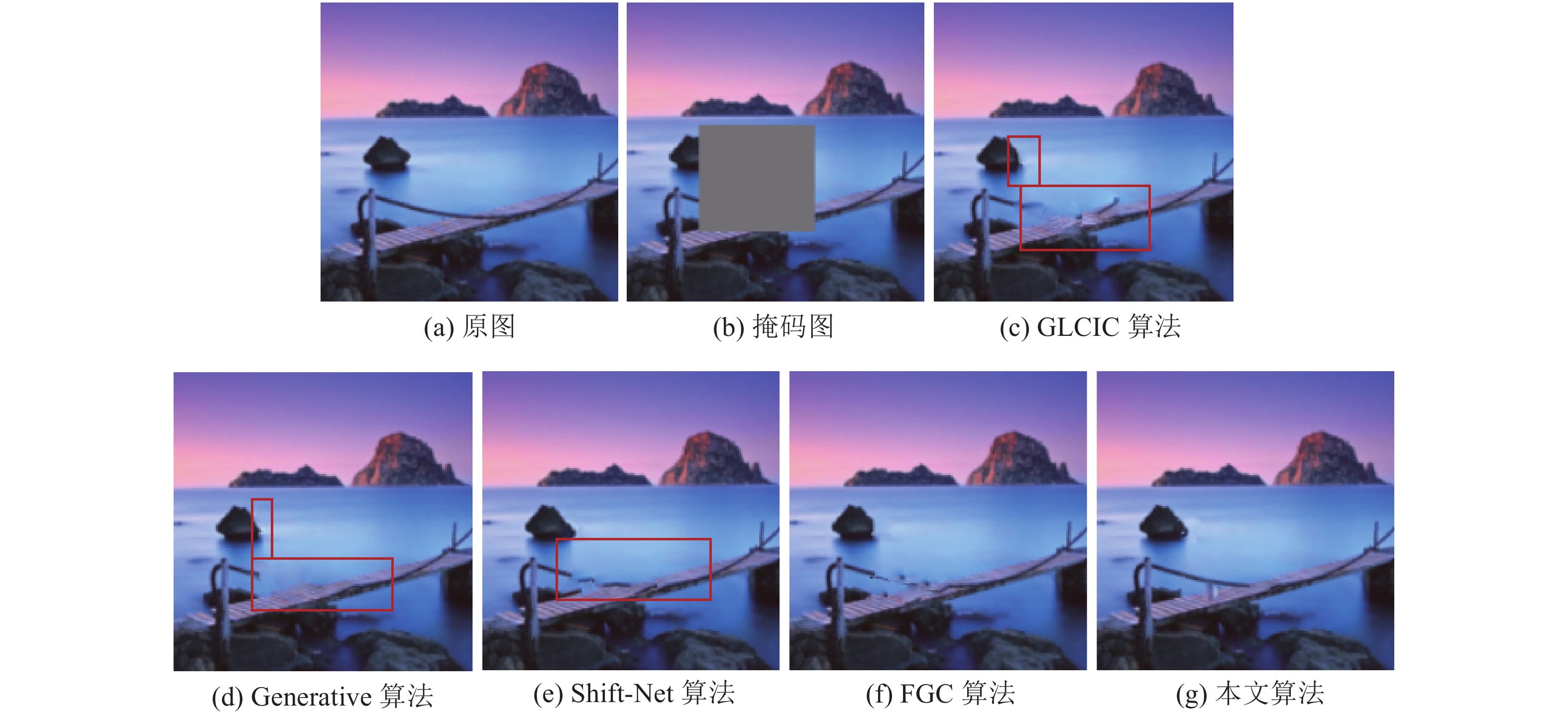 图4是在ImageNet数据集上将本文提出算法与GLCIC算法[11]、Generative算法[16]、Shift-Net算法[24]和FGC算法[25]对背景复杂且包含较多纹理细节的风景图像修复的对比结果,缺失区域包含背景及前景的较多纹理细节。从图4可看出:GLCIC算法生成的结构无法与周围未破损区域保持视觉连贯性,部分像素点发生重叠。Generative算法在屋顶处的修复结构纹理较GLCIC算法有一定的改善,但由于判决器尺度过大,结合未破损区域生成了多余结构。Shift-Net算法修复背景复杂图片时很难生成合理的结构。FGC算法生成的结构较合理,但细节纹理模糊。本文提出算法能生成合理的结构和纹理,无边缘模糊和重影,语义与原图相符,修复效果较好。