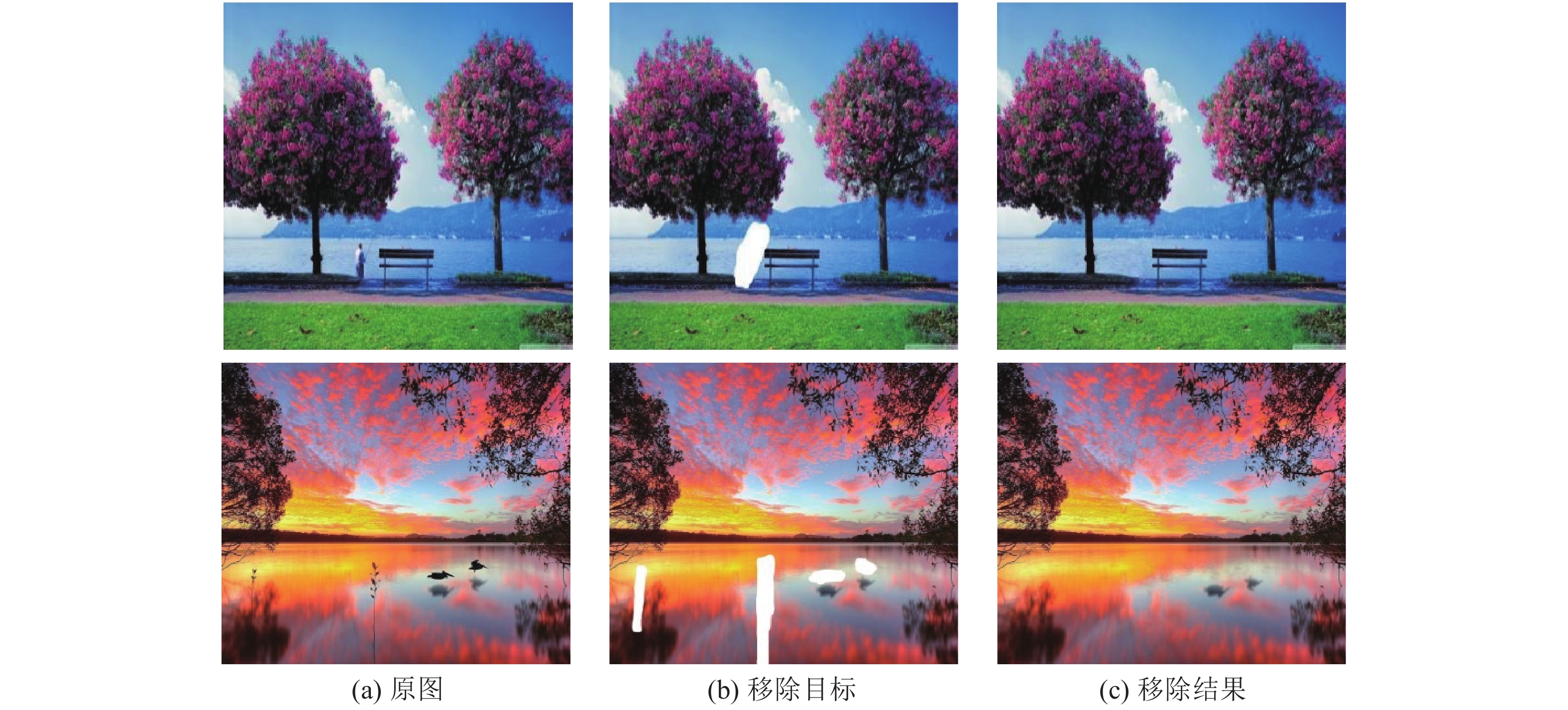 图7为本文提出算法ImageNet数据集上目标物移除的实验结果。从图7中可看出:本文提出算法可在移除的目标物处生成与周围语义一致的结构信息,3个不同尺度的判决器保证修复的细节纹理一致性。