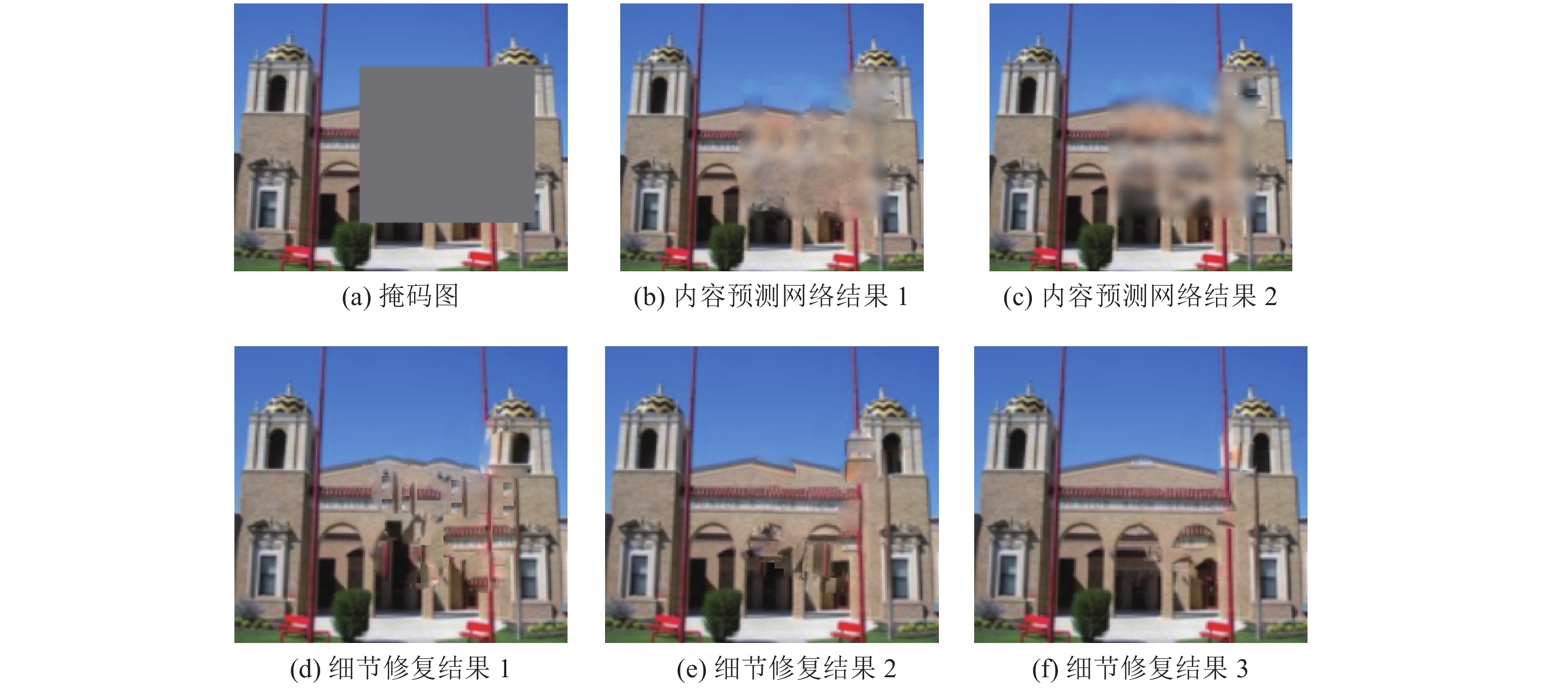 ${D_1}$ 、${D_2}$ 、${D_3}$ 分别表示3个不同输入的判决器,其以破损区域的中心为输入尺度区域的中心。细节修复网络的损失函数为:$$ {L_{\text{X}}} = {\lambda _1}{L_{{\text{rec}}}} + {\lambda _2}{L_{\max }} + {\lambda _3}{L_{{\text{mid}}}} + {\lambda _4}{L_{\min }} $$ (8) 式中,