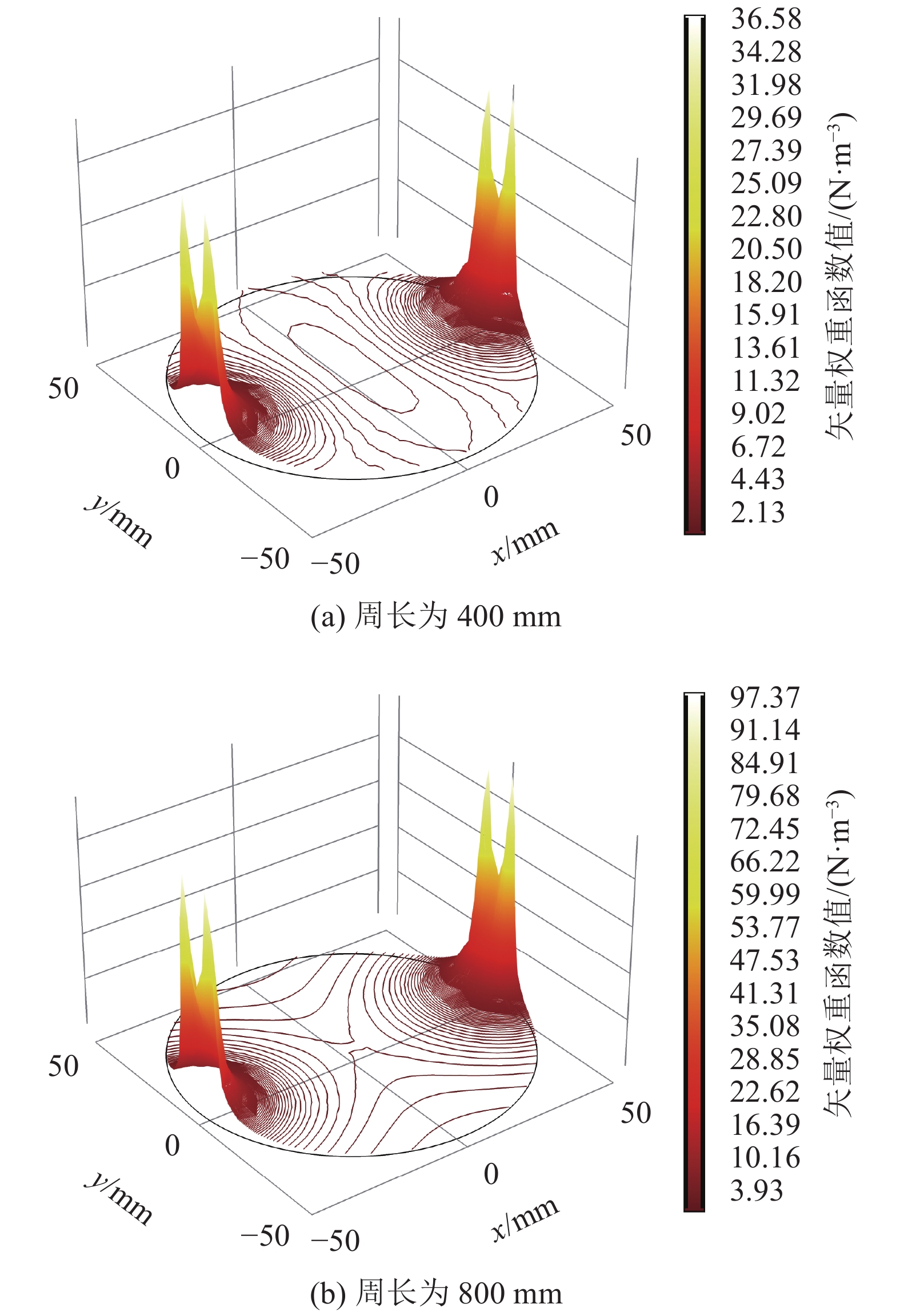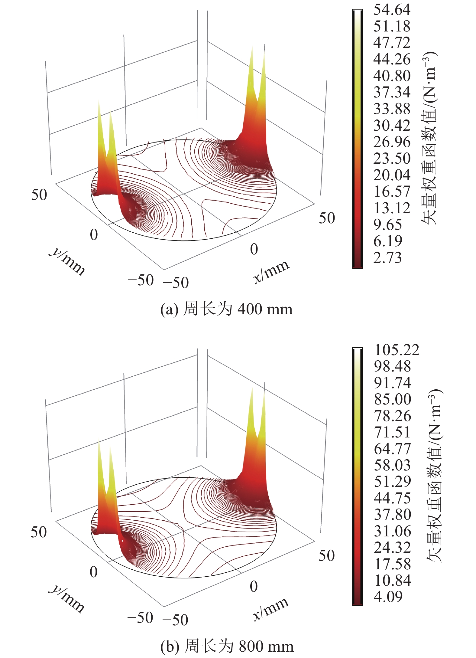 获得具有不同周长的正八边形线圈、矩形线圈、圆形线圈3种线圈矢量权重函数如图9~11所示。