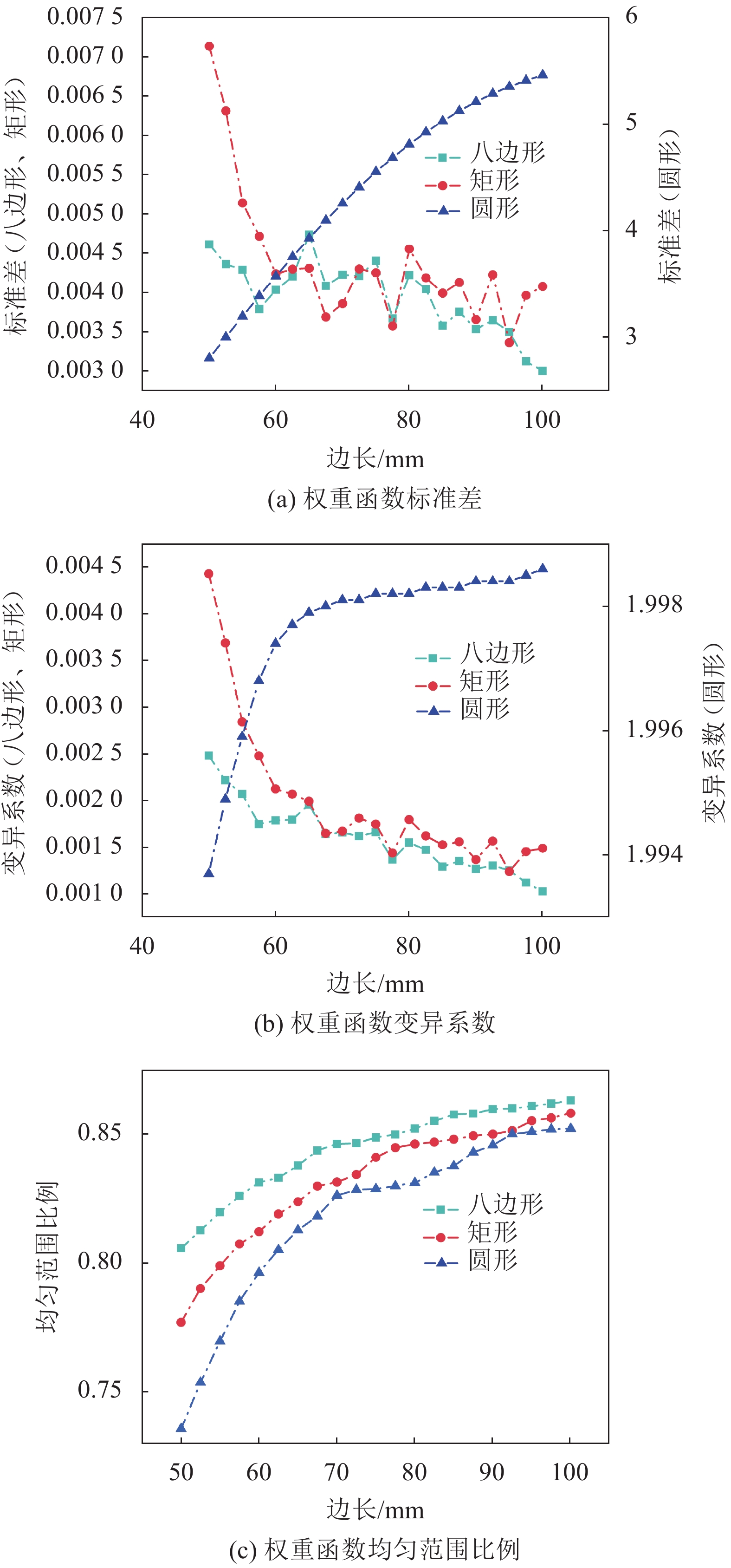 由图12(a)和(b)可知:圆形线圈的矢量权重函数标准差初始值相对较大,且随着尺寸增加逐渐增加;在去除平均值影响后,变异系数同样未得到改善,表明圆形线圈的矢量权重函数在被测管段内分布最不均匀。矩形线圈和正八边形线圈的矢量权重函数标准差及其变异系数均逐渐下降,其中,正八边形线圈标准差从50 mm到100 mm降低了34.89%,变异系数下降了58.73%,说明随着正八边形线圈边长增长,矢量权重函数分布逐渐均匀化;虽然矩形线圈边长也出现了较大的降幅,但其峰值数据过高,使得正八边形线圈的标准差和变异系数最小值仍相差12.13%和21.08%。由图12(c)可知,正八边形线圈在被测管段内矢量权重函数均匀范围比例最大,即正八边形线圈的矢量权重函数均匀的区域所占比例最大,比矩形线圈多0.6%。
