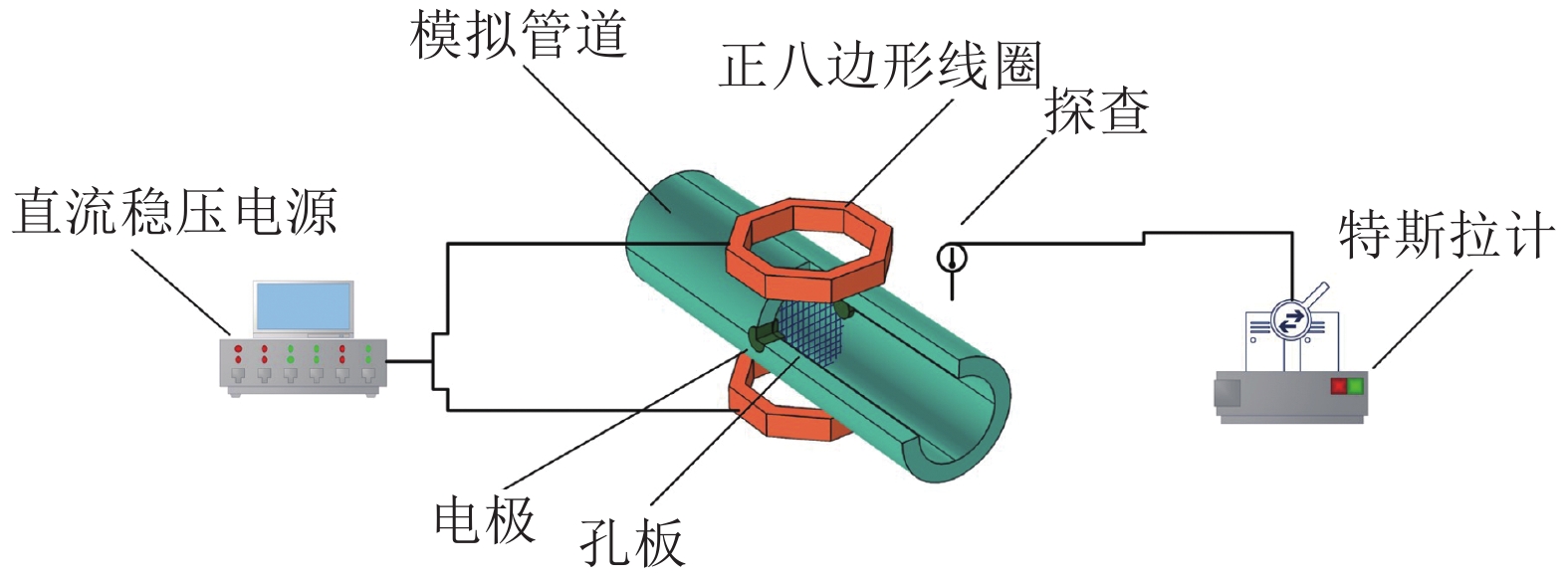 为验证正八边形励磁线圈对电磁流量计磁场优化的效果,搭建了磁场测试实验平台。实验平台包括直流稳压电源、形状和尺寸完全与仿真相同的待测正八边形线圈(边长为100 mm)、特斯拉计、模拟管道(管道直径为100 mm),以及孔板截面等,实验平台结构图如图13所示。通常来说,每次流量采样时测量管内工作磁场已处于稳定状态,可以理解为电磁流量计的流量信号是在励磁电流为直流电流时完成采样,因此,本实验采用直流励磁方式进行测试,完成正八边形线圈电磁流量计磁场分布特性实验研究。