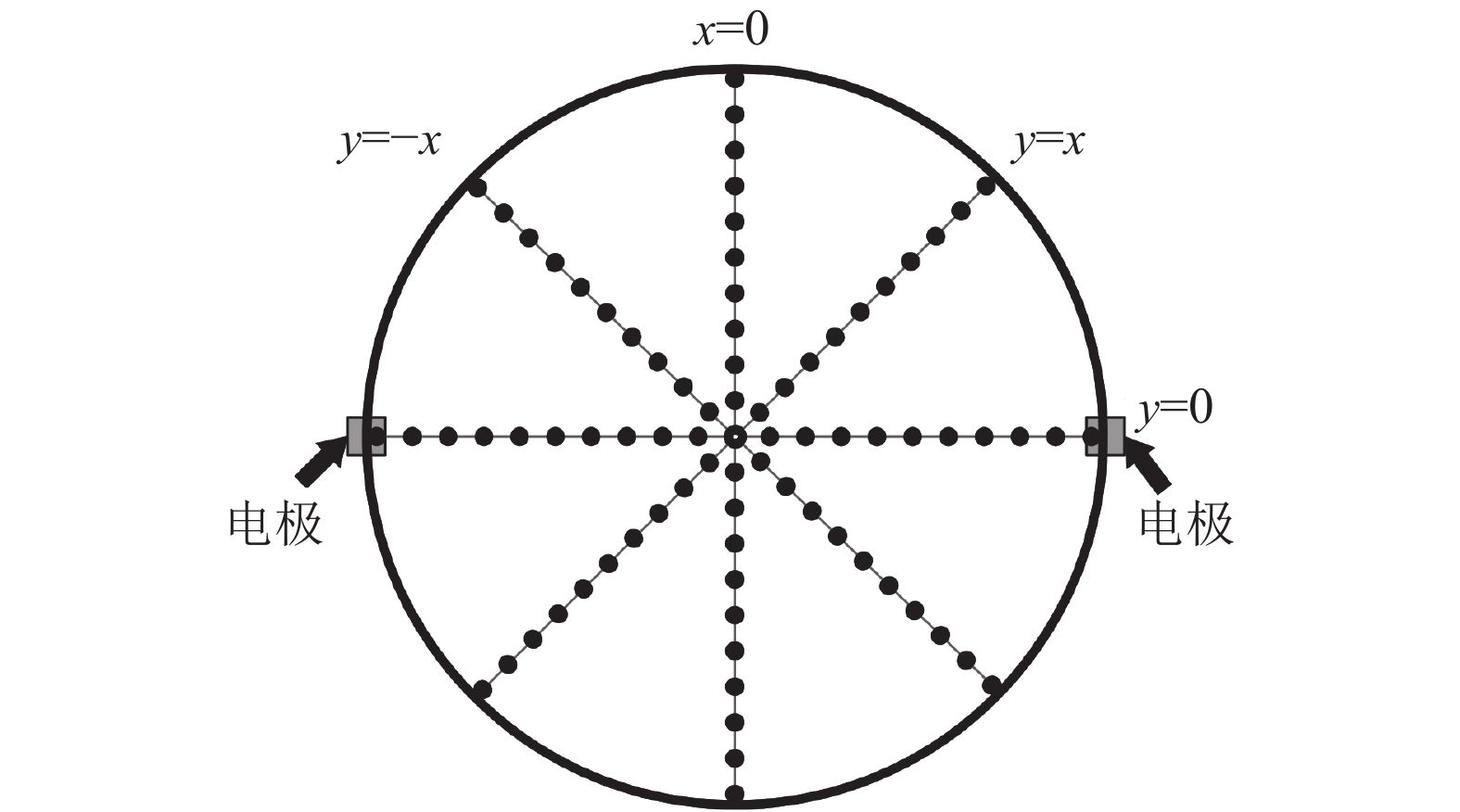 为了保证实验测试的准确性,本文利用3D打印技术制作正八边形线圈骨架,并通过绕线机绕制了正八边形线圈。实验步骤如下:系统充分稳定后,直流稳压电源为正八边形线圈通1 A的直流激励电流(与仿真相同),线圈通电后在管道截面产生磁场。对孔板截面进行区域化处理,利用4条截线(y=x,y=−x,x=0,y=0)划分管道截面区域,每条截线上等间距设置21个检测点,共计81个测试点,如图14所示。