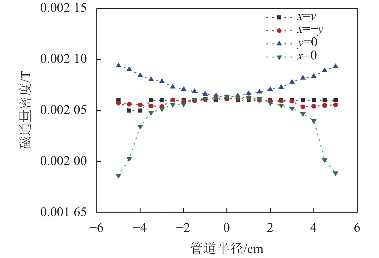 由图15可知:在管道截面中心处半径小于2 cm的区域范围内,磁通量密度分布较为均匀。随着测试点向管壁移动,磁通量密度逐渐变化,磁场均匀度降低。在靠近管道边缘位置时,在x=y和x=−y两条截线上磁感应强度波动不大,但是在x=0截线(线圈连线)上磁感应强度减小,在y=0截线(电极连线)上磁感应强度增加,实验结果与仿真结果保持一致。为了定量分析正八边形线圈产生磁场的均匀性,定义无量纲磁场均匀度