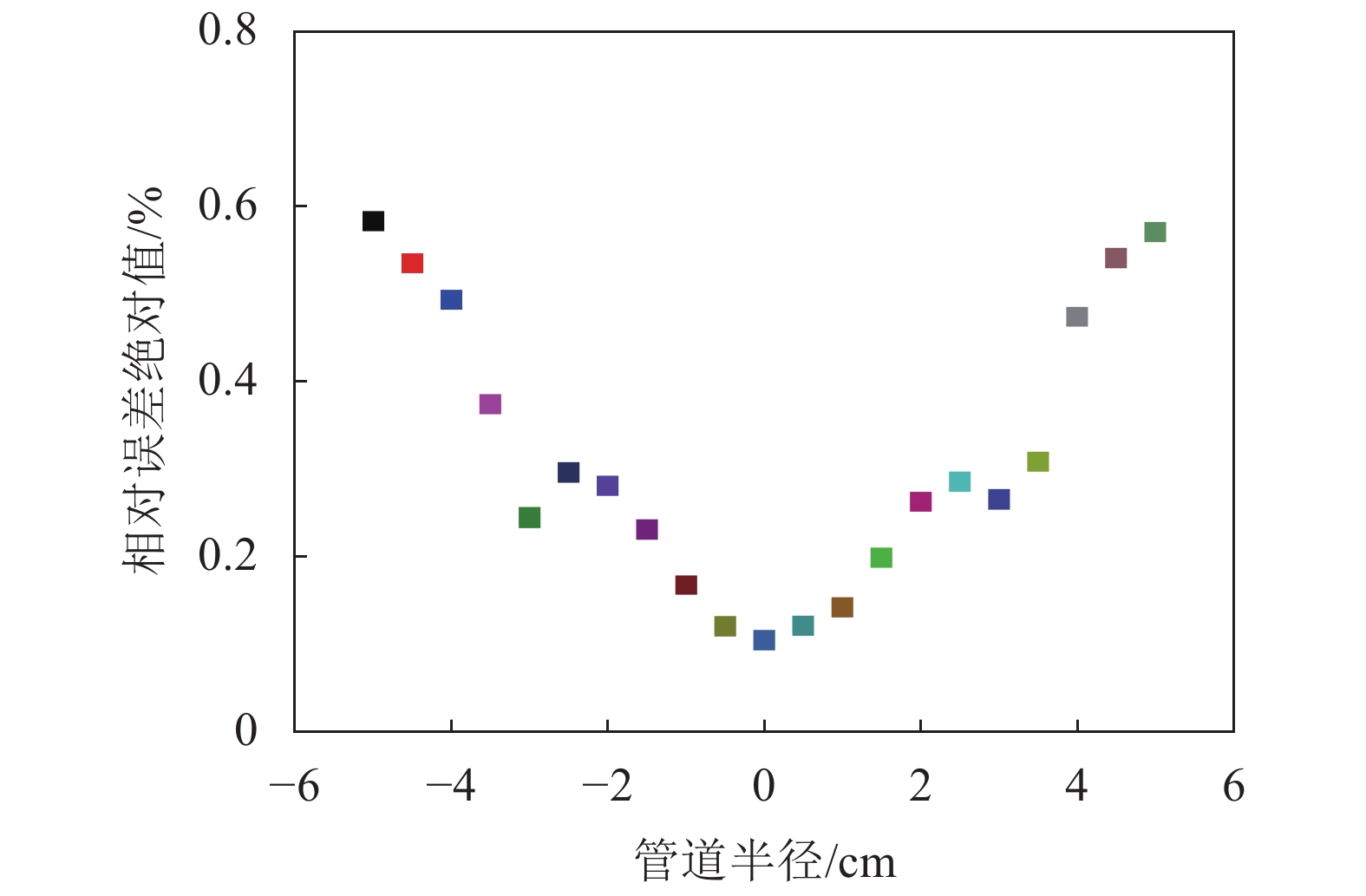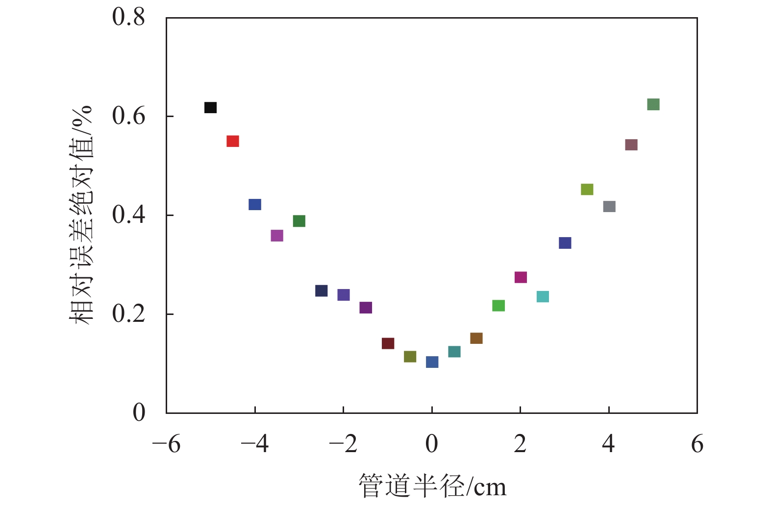 由图16、17可知:当检定点位于管道中心半径小于2 cm区域内时,相对误差绝对值小于0.3%;当检定点位置向外逐渐靠近管壁时,测量的相对误差绝对值逐渐增大;在靠近电极位置时最大相对误差为0.63%;在靠近线圈位置时最大相对误差为0.58%。表明正八边形线圈磁场具有良好的均匀性。