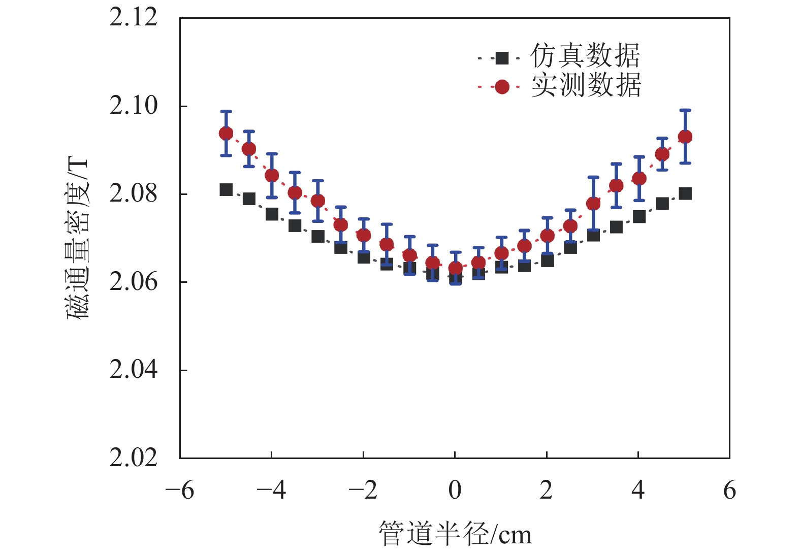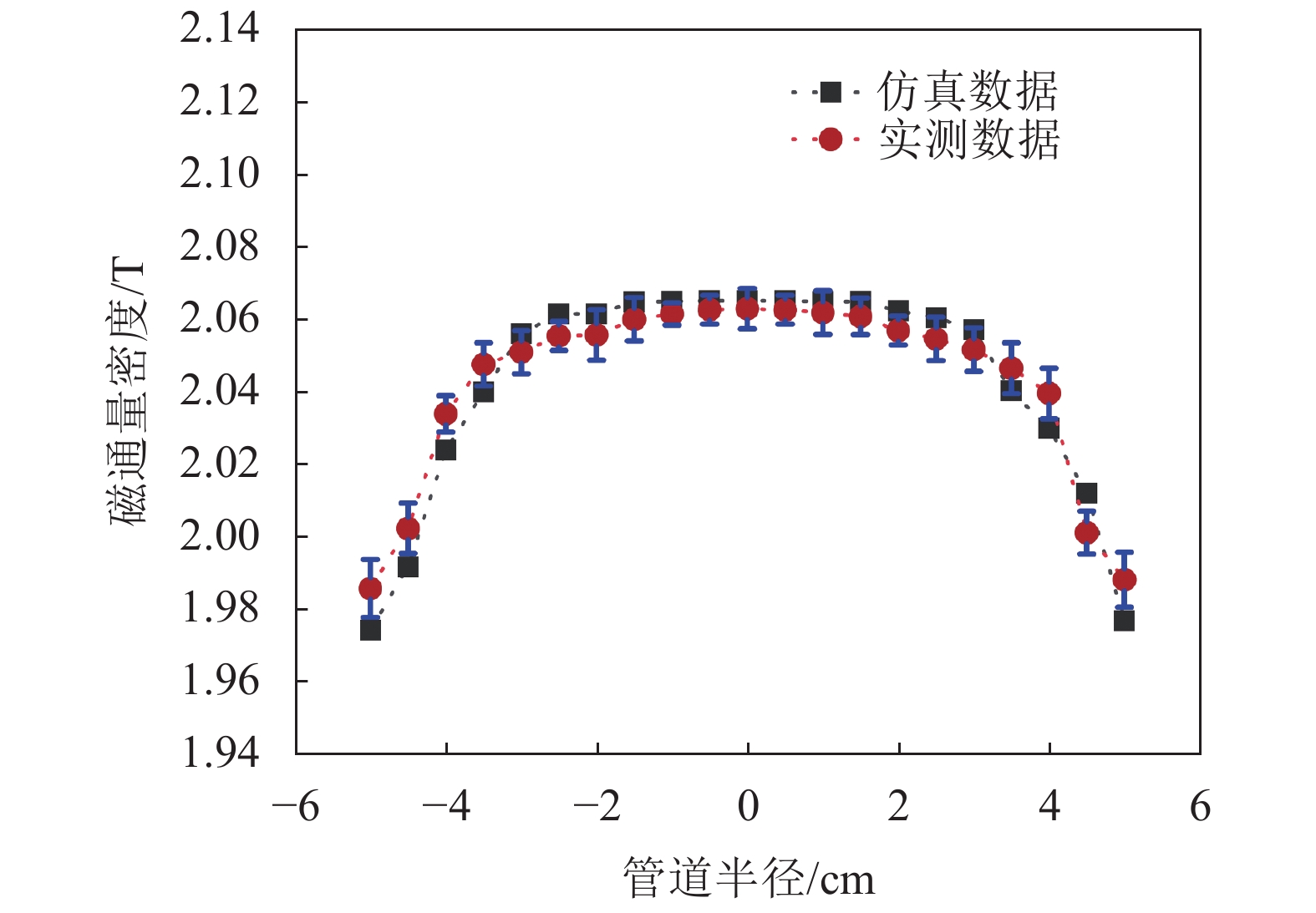 由图18和19可知:经过多次测量取平均值后,在管道中心位置测量误差较小,靠近管道边缘处测量误差逐渐增大,实际测量线圈磁通量密度和仿真数据基本吻合。线圈方向(Y轴方向)最小磁通量密度为1.986 mT,电极方向最大磁通量密度为2.081 mT,在管道中间区域磁通量密度维持在2.063 mT左右,在整个管道区域内磁通量密度总体波动范围在±1.1 mT以内,表明正八边形线圈产生的磁场均匀度高,且磁场强度满足电磁流量计的测量需求。