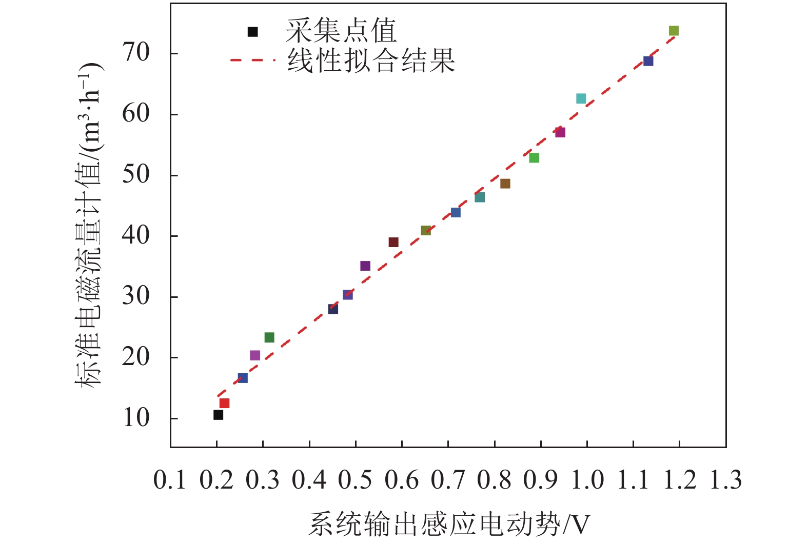 通过数据拟合正八边形线圈电磁流量测量系统的输出电压与流速的线性关系(图21),如式(14)所示: