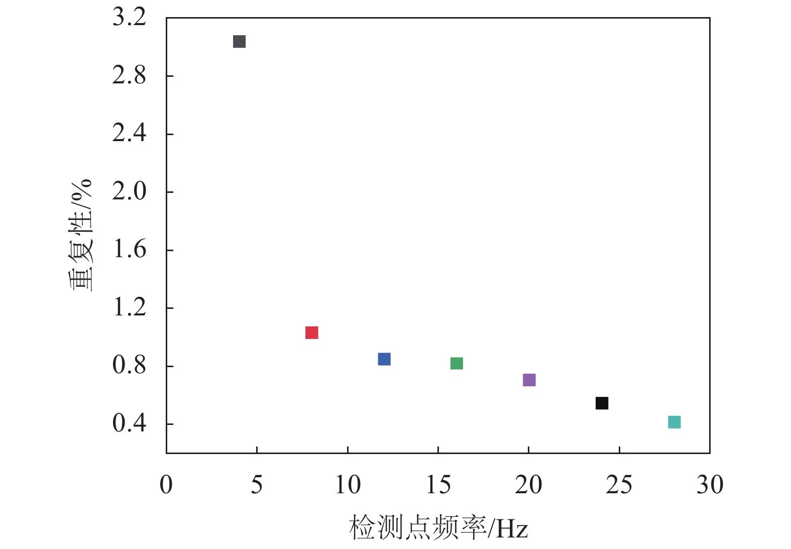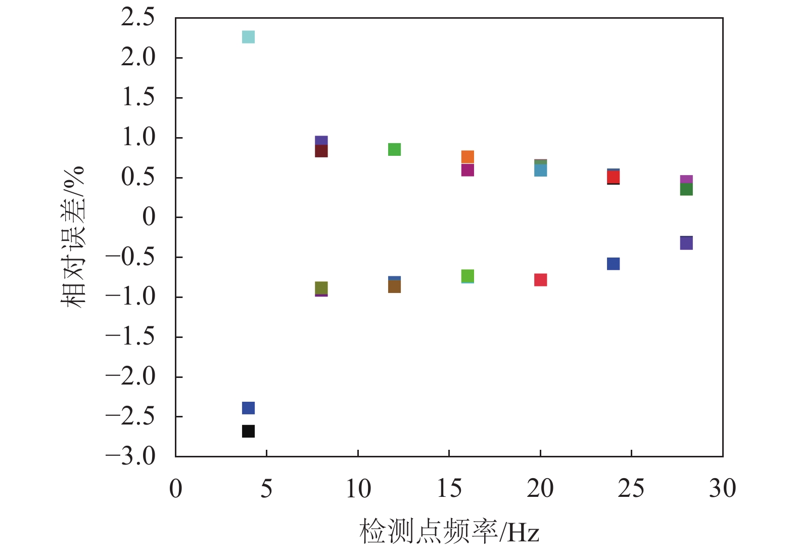 显示值误差/%重复性/% 28 73.546 73.877 0.331 0.450 0.160 0.417 73.428 73.687 0.259 0.353 73.842 73.612 –0.230 –0.311 73.725 73.486 –0.239 –0.324 24 63.483 63.826 0.343 0.540 0.150 0.546 63.564 63.875 0.311 0.489 63.361 63.6822 0.3212 0.507 63.485 63.117 –0.368 –0.579 20 51.688 51.283 –0.405 –0.784 0.154 0.708 51.437 51.774 0.337 0.655 51.245 51.576 0.331 0.646 51.136 51.438 0.302 0.591 16 40.383 40.623 0.24 0.594 0.210 0.822 40.641 40.338 –0.303 –0.746 40.754 40.456 –0.298 –0.731 40.239 40.547 0.308 0.765 12 32.642 32.376 –0.266 –0.815 –0.274 0.854 32.579 32.298 –0.281 –0.863 32.463 32.182 –0.281 –0.866 32.682 32.963 0.281 0.860 8 21.368 21.571 0.203 0.950 0.301 1.035 21.422 21.227 –0.195 –0.910 21.384 21.563 0.179 0.837 21.404 21.215 –0.189 –0.883 4 9.921 9.684 –0.237 –2.389 1.002 3.043 9.892 9.627 –0.265 –2.679 9.745 9.966 0.221 2.268 9.627 9.928 0.301 3.127 根据流量检定规则对数据进行处理,获得各流量点单次检定相对显示值误差分布,如图22所示;各流量检定点相对显示值误差分布如图23所示;正八边形线圈电磁流量测量系统重复性误差分布如图24所示。