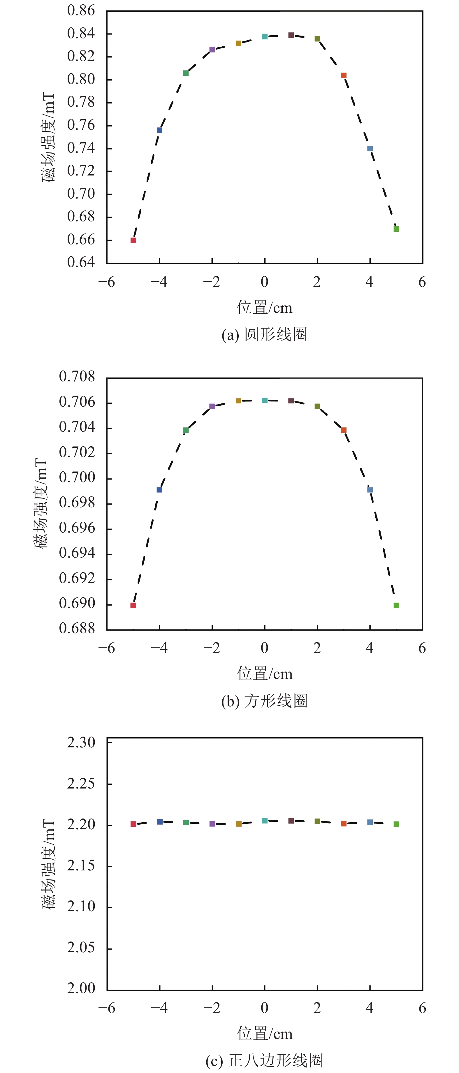 从图3可知:从磁场强度来看,正八边形线圈磁场强度>圆形线圈磁场强度>方形线圈磁场强度;从磁场均匀度来看:正八边形线圈产生的磁场曲线最为平缓;其次是方形线圈,其产生的磁场强度曲线的平缓程度略大于圆形项圈产生的磁场强度曲线;这表明正八边形线圈产生的磁场均匀度最高。