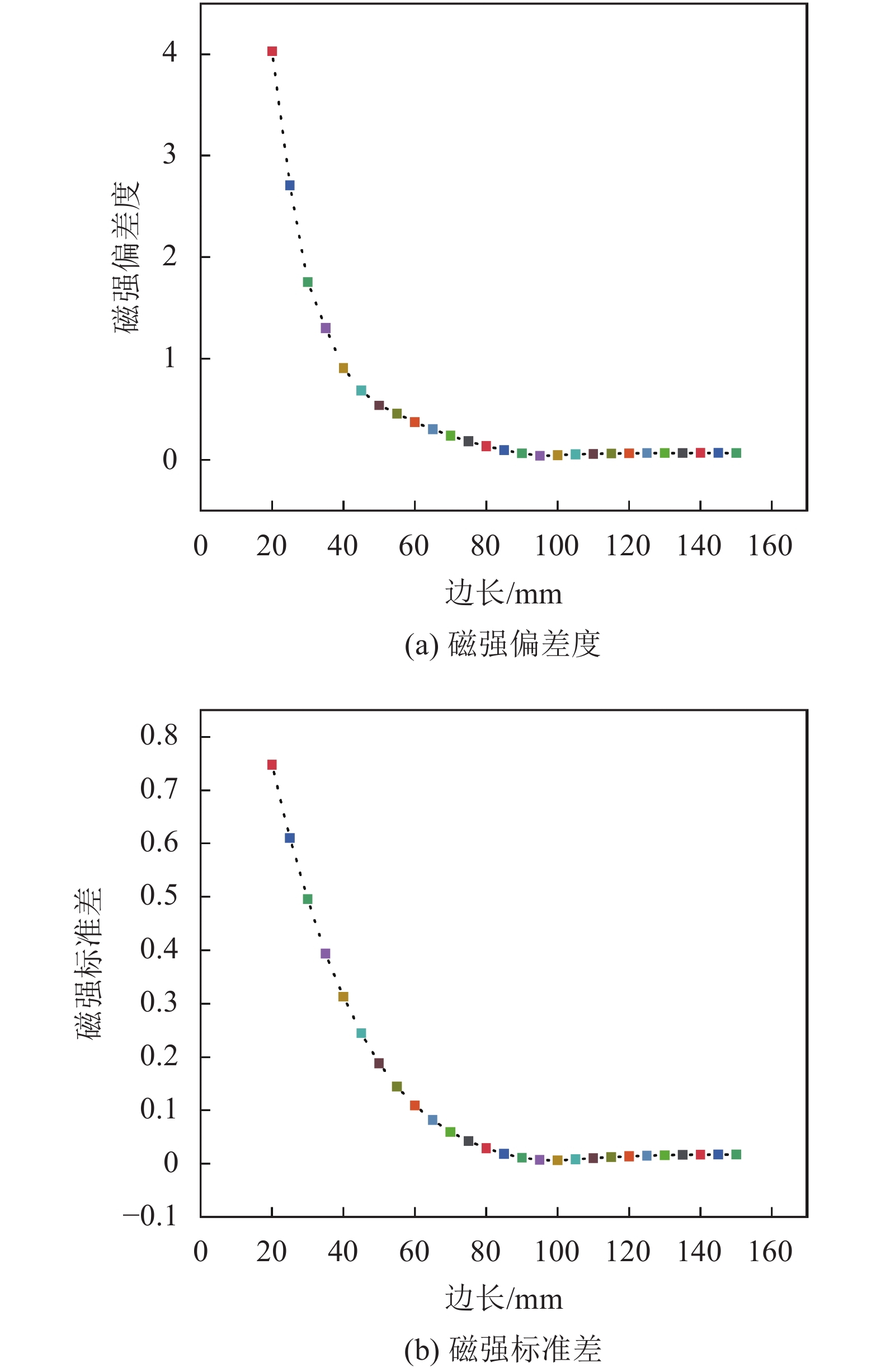$ d_{k}=\sqrt{B_{x}^{2}+B_{y}^{2}} $ ,为点$ \left( {x,y} \right) $ 磁感应强度大小;$d_{0}=\dfrac{1}{n} \displaystyle\sum_{k=1}^{n} d_{k}$ ,为磁感应强度的平均值。对仿真所得数据进行处理,获得正八边形励磁线圈产生磁场的磁强偏差度和磁强标准差随线圈尺寸变化情况,如图7所示。由图7可知:边长从20 mm到100 mm过程中,线圈的磁强偏差度和磁强标准差分别下降了98.87%和99.12%;边长在100~150 mm时,线圈的磁强偏差度和磁强标准差又分别上升了49.00%和161.56%;磁强偏差度和磁强标准差均在边长为100 mm时取得最小值,说明线圈边长为100 mm时,磁场最为均匀。综上,正八边形线圈边长为100 mm时,产生的磁场在磁场强度和磁场均匀度均表现最优,因此,确定边长100 mm为正八边形线圈最优结构参数。