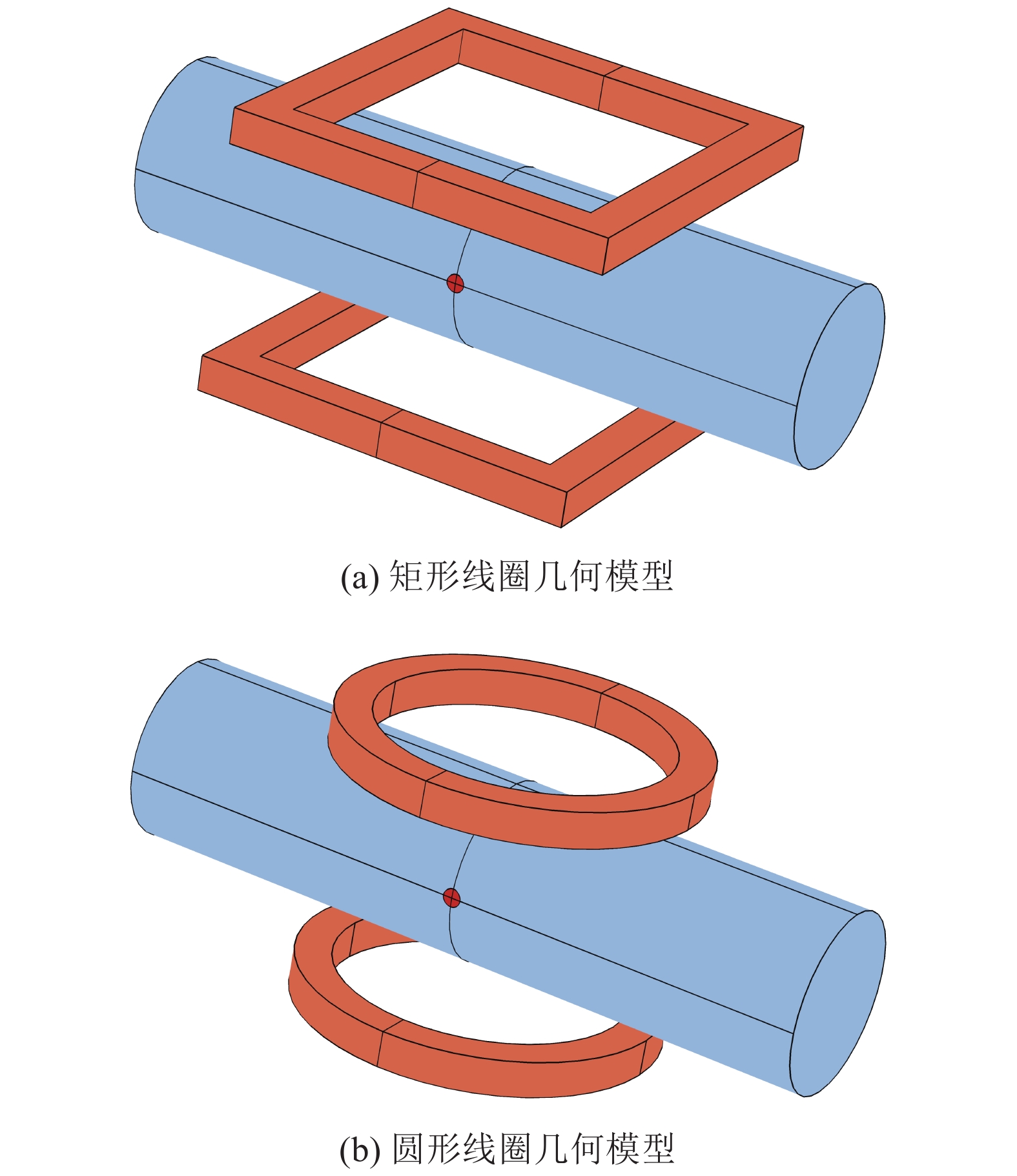 电磁流量计优化从根本上是为了通过优化矢量权重函数分布来提高电磁流量计的测量精度,因此对正八边形线圈矢量权重函数进行分析十分重要。由于线圈边长在50 mm以下及边长在100 mm以上时,磁场不均匀程度高,因此,本研究将权重函数仿真研究的参数化扫描边长的范围缩小为50~100 mm。在此引入矩形线圈和圆形线圈作为对比,圆形线圈直径参数化扫描范围为63~127 mm,矩形线圈边长参数化扫描范围为100~200 mm,为保证数据的一致性,后续分析中将以周长相等为条件对矩形线圈边长进行折算对比,矩形线圈和圆形线圈的几何模型如图8所示。