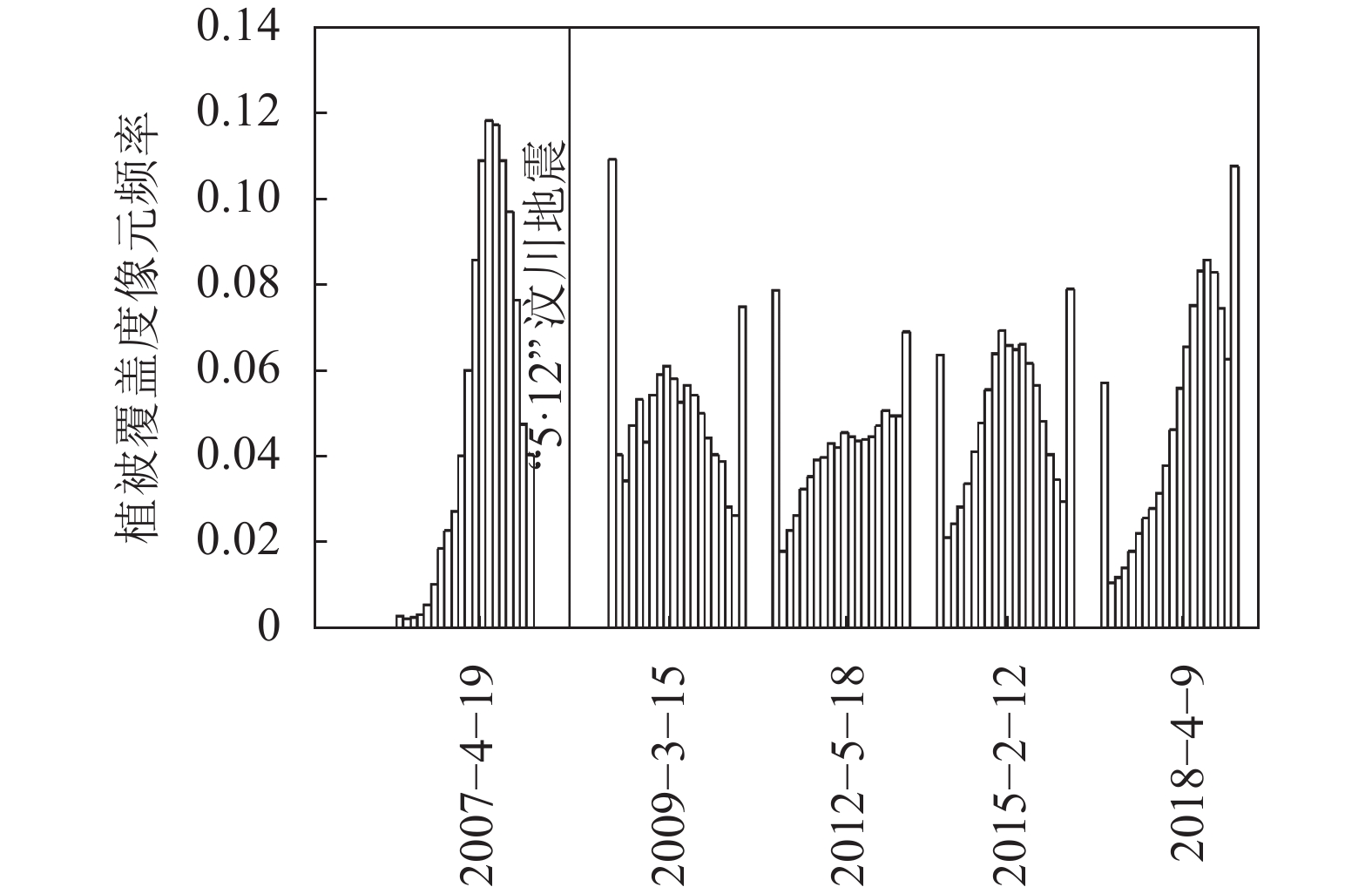 ${\text{VF}}{{\text{C}}_t}$ 为震后第t年的植被覆盖度,$ {\text{VF}}{{\text{C}}_{{\text{post}}}} $ 为震后植被覆盖度最低的一期指数,$ {\text{VF}}{{\text{C}}_{{\text{pre}}}} $ 为地震前植被指数。3. 结 果