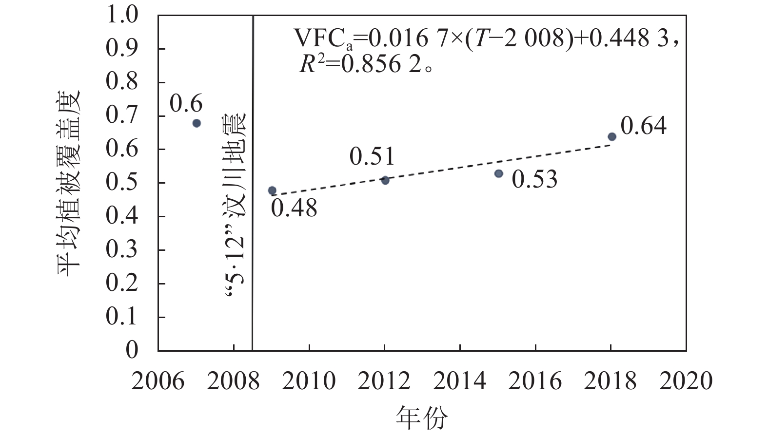植被恢复情况对崩滑物源的活动有一定的影响。为分析研究区植被动态变化,对原始Landsat影像进行剪裁、辐射定标、大气矫正等预处理,根据式(2)、(3)分别计算出各年份的植被指数NDVI和植被覆盖度VFC,并将植被覆盖度VFC以0.05的间隔分为20类,得到植被覆盖度VFC值的频率分布(图10)。由图10可知:震前2007年研究区植被状况良好,植被覆盖度平均值为0.68;2008年汶川地震导致研究区植被覆盖度频率分布格局发生较大变化,植被覆盖度平均值急剧下降;2009年研究区植被覆盖度平均值降低到0.48。随着时间的推移,研究区植被覆盖度逐渐增加,2012、2015和2018年研究区植被覆盖度平均值分别为0.51、0.53、0.64,植被覆盖度频率分布逐渐趋于震前状态。根据这5期数据的植被覆盖度平均值VFCa探究其随年份的变化趋势,如图11所示,预测震后植被覆盖度恢复到震前水平至少需要14 a。