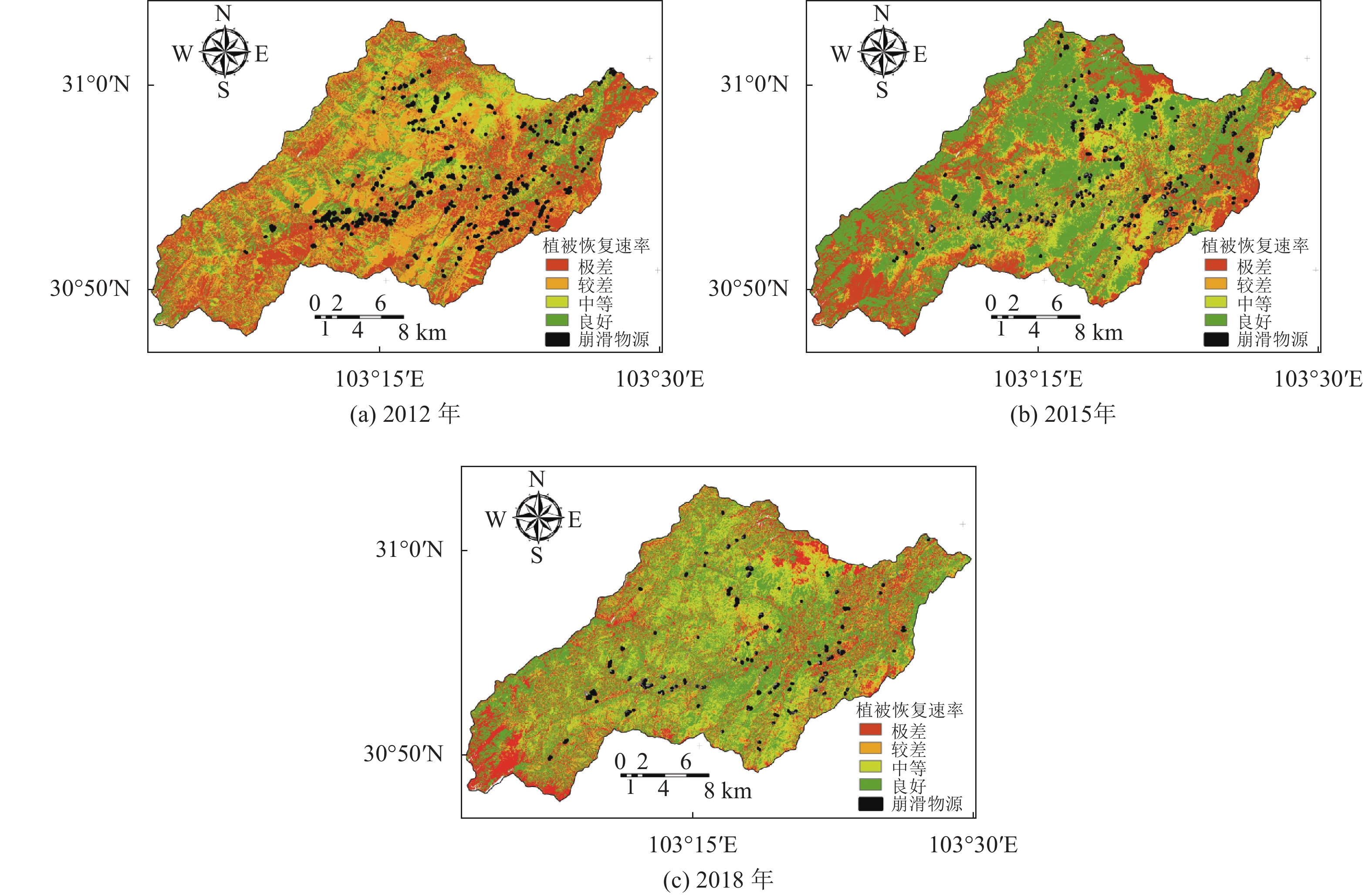 3)震前2007年研究区植被状况良好,震后随着时间的推移,植被覆盖度以线性形式增长,预测震后至少14 a植被覆盖度恢复到震前水平。2012、2015、2018年植被恢复中等及以上的区域分别占37.32%、64.24%、70.69%,研究区植被逐渐恢复。且崩滑物源在植被恢复极差的区域面积最大、活动性最高,而在植被恢复程度高的地方,崩滑体的活动性低且随着时间的推移降低,植被的恢复能有效减弱崩滑物源的活动,降低发生崩滑灾害的概率。