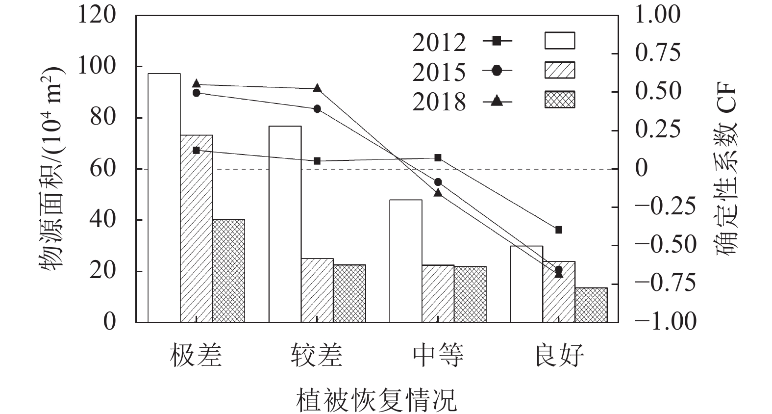 根据表3对崩滑物源在各植被恢复情况上的分布面积进行统计,并利用确定性系数模型计算崩滑物源在各等级植被恢复情况的CF值,得到2012、2015和2018年崩滑物源在各植被恢复情况上的空间分布特征及演化规律,结果如图13所示。